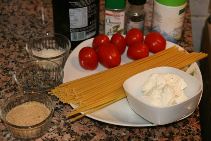 Bucatini (testenine) z gratiniranim paradiznikom in sirom buffalo mozzarella – Sestavine za 4 osebe: