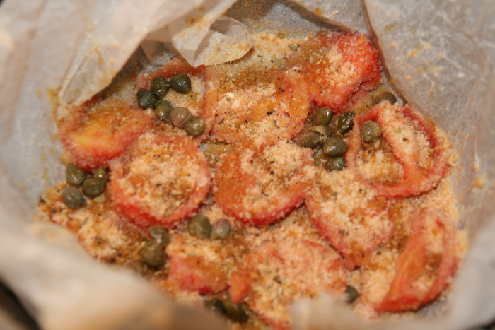 Dajte paradiznik za par minut v vrelo vodo. Odcedite jih in olupite, prerezite jih na pol in odstranite semena. Navlazite peka papir in z njim oblozite pekac. Dajte paradiznike v pekac, postavite jih tako da odrezan del je proti vrhu. Potresite z veliko kolicino krusnih drobtin. Zacinimo s scepcem soli in poprom, jih aromatizirajte z malo origana. Na koncu dodamo malo olja in pecite na 180 stopinj za 15-20 minut, dokler paradizniki niso gratinirani. Skuhajte testenine v zavreti in posoljeni vodi. Dajte gratinirane paradiznike v ponev skupaj z njihovo omako. Dodajte testenine v ponev, premesajte in pustite eno minuto na mocnem ognju. Ugasnite stedilnik, dodajte sir buffalo mozzarella in nariban ovcji sir, premesajte in postrezite.