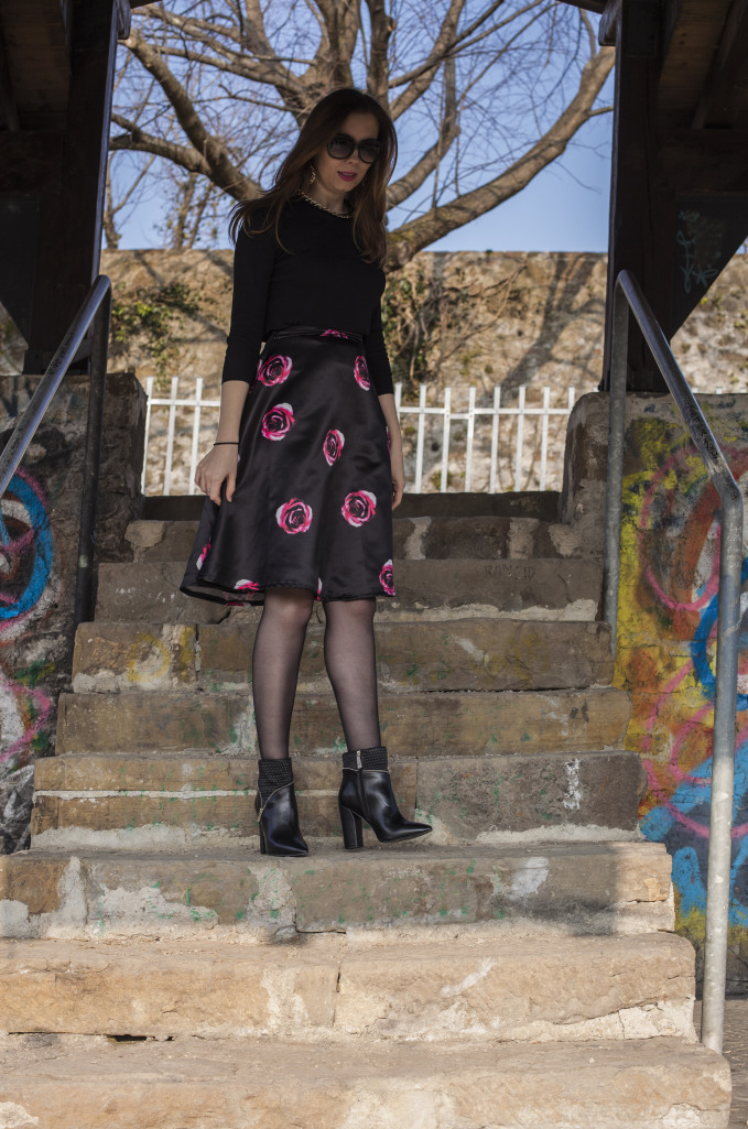 In passato avete potuto già vedere i miei outfit con la gonna midi, e oggi ve ne propongo un altro. Questa volta è un look total black, con la stampa floreale sulla gonna. Vi piace?