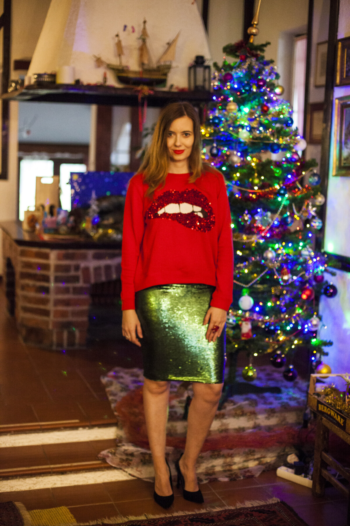 Oggi invece per voi ho il mio outfit, indossato per la vigilia. Ho scelto una gonna a paillettes e un maglioncino rosso, perché il colore rosso non deve mai mancare negli outfits di Natale. Abbiamo un po’ giocato con il flash, cosi alcune foto, dove abbiamo usato il flash , sono chiare, le altre senza flash invece sono molto colorate.