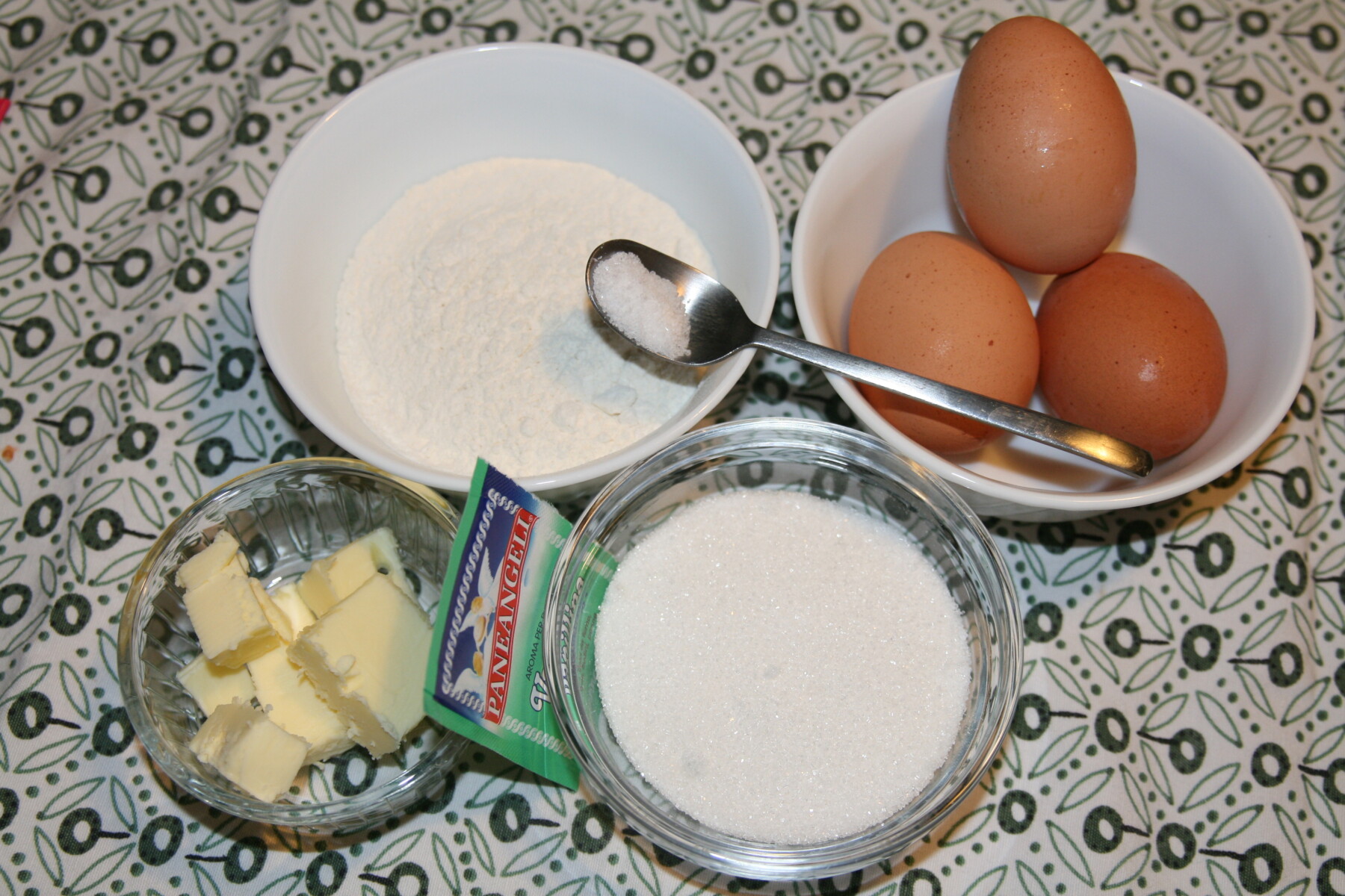 Tagliate il burro a tocchetti e rivestite lo stampo con burro fuso freddo e della farina. Preriscaldate il forno a 180 gradi. Setacciate la farina, fate sciogliere il burro a fuoco basso. Rompete le uova in una ciotola e aggiungete lo zucchero a pioggia, e il sale. Fate cuocere a bagnomaria a fuoco bassissimo. Mescolate con una frusta a mano oppure con frusta elettrica. Il composto triplicherà di volume e diventerà quasi bianco. State attenti che non superi i 50 gradi, altrimenti le uova si cuociono. Togliete dal bagnomaria, versate in una terrina e sbattete fino al raffreddamento del composto. Versate a pioggia la farina setacciata mescolando delicatamente con una spatola. Aggiungete il burro fuso e la vanillina. Mescolate con l’aiuto della spatola. Riempite lo stampo fino a 2/3 dell’altezza, infornate per 30-35 minuti a 180 gradi. Quando è cotta mettetela fuori dallo stampo e fatela raffreddare su una gratella.