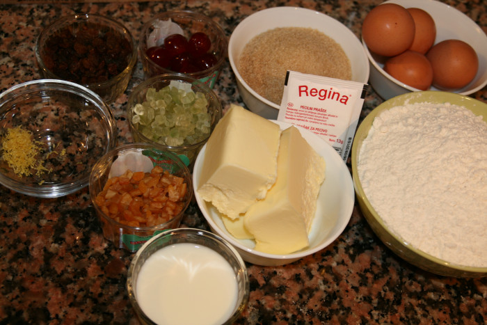 V skledi zmesajte maslo z leseno zlico, dokler se ne zmehca. Pocasi dodajte sladkor, jajca, naribano limonino lupinico in scepec soli, mesajte. Dobro premesajte, dodajte presejano moko, pecilni prasek in dodajte mleko, kot je potrebno, pomembno je da zmes ne postane prevec redka. Dajte rozine v toplo vodo, nato jih stisnite in z drugimi kandiranim sadjem dajte v mesanico. Vse skupaj premesajte in vlijte mesanico v model za plumcake (25 cm ali 26 cm dolg), oblozen s papirjem za peko. Pecite v ogreti pecici na 180 stopinj priblizno 60 minut. Vzamemo iz pecice in pustite, da se ohladi.