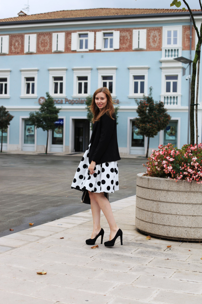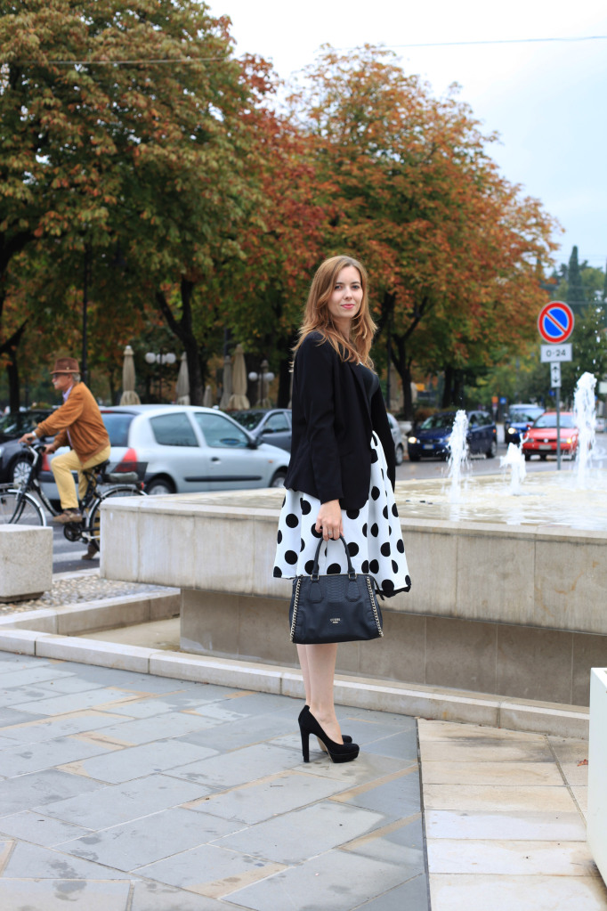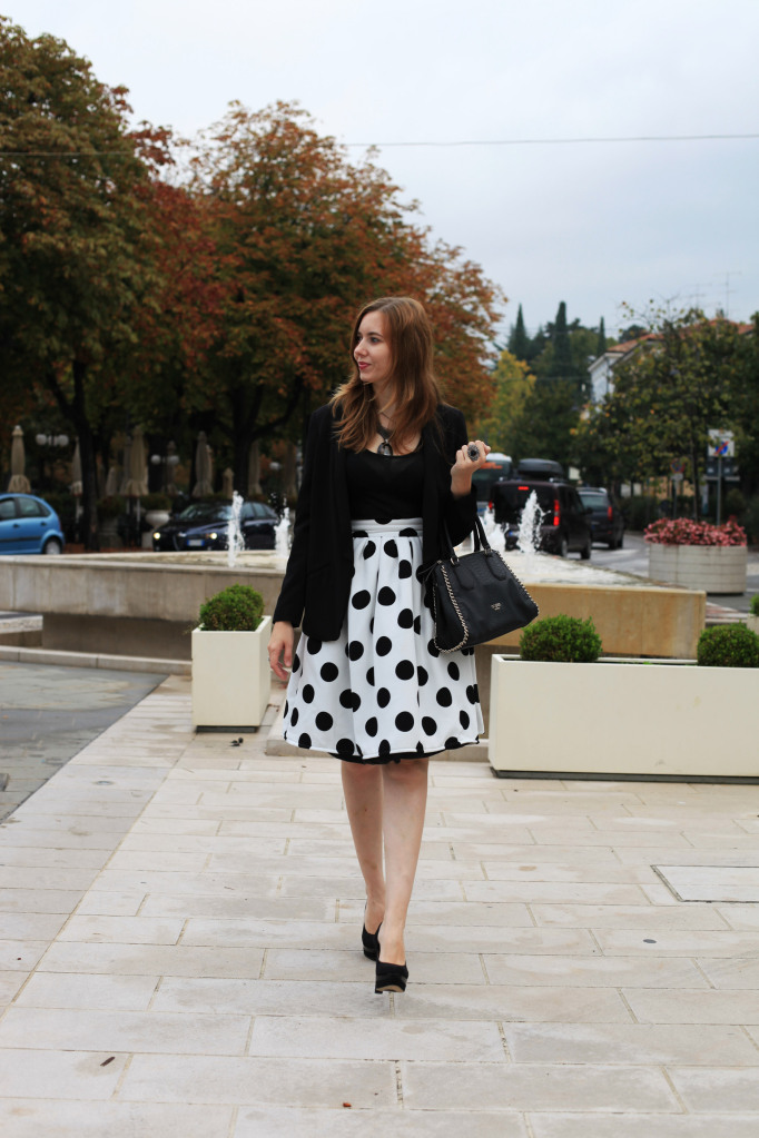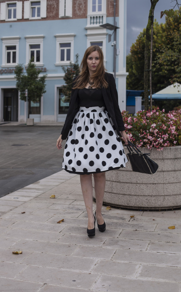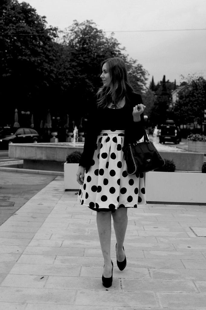 Outfiti u crno-bijeloj boji su klasika, uvijek idu dobro. Kada sam proslog mjeseca izasla po prvi put sa suknjom koje vidite na ovim fotografijama, sam mislila ju kombinirati sa kosuljom sa tackama, ali u obrnutom redoslijedu, s crnom pozadinom i bijelim tackicama, ali mi se nije dopalo, nisam se dobro osjecala tako da sam suknju kombinirala sa crnom majicom, kao sto mozete vidjeti na fotografijama. Ali, tada je bilo vec vece i nismo imali vremena, da slikamo, pa sam prosle nedelje u pratnji mog svekra otisla slikati ovaj outfit. Malo sam bila raztresena jer su ljudi prolazili non stop, i nisam zelela da su i oni na fotografijama, jer sa Zakonu o privatnosti danas nikad se ne zna, da me netko ne kontaktira i pita me za ostetu 🙂 Ostavljam vas uz moj outfit i zelim va prijatan dan!