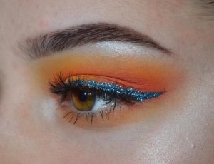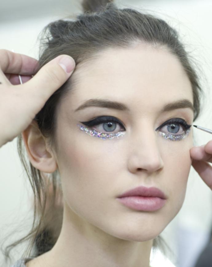 Prima abbiamo parlato dell’eyeliner colorato, ora invece ci propongo un classicissimo cateye nero accompagnato da una sferzata di glitter sulla rima inferiore, due dettagli a contrasto che vi regaleranno uno sguardo seducente e…. Sparkle!