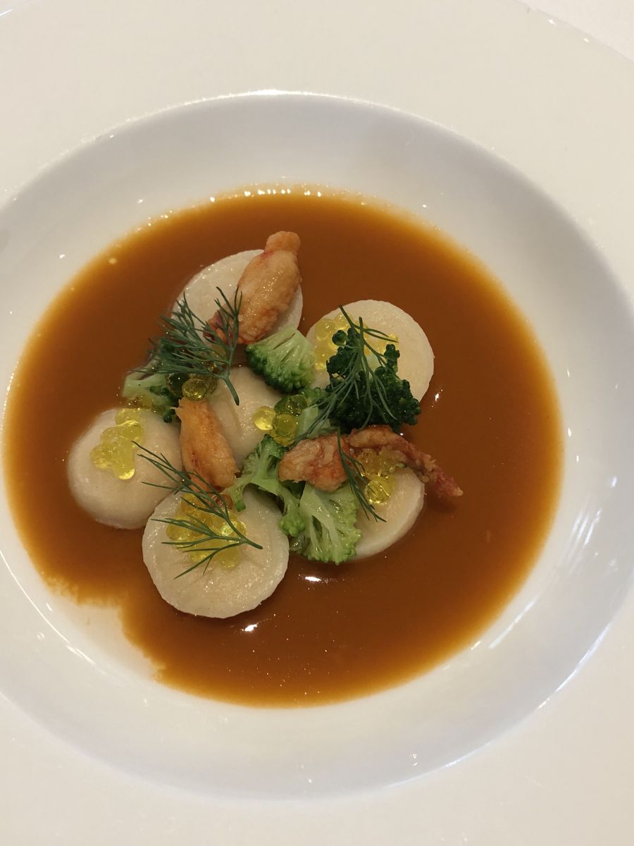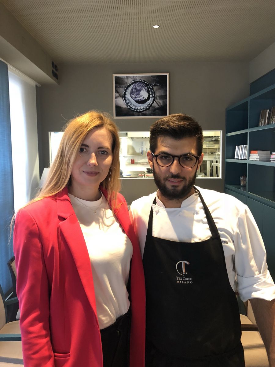 Entrando nel ristorante Tre Cristi di Milano, che si trova in zona Porta Nuova, colpisce da subito l’eleganza e la raffinatezza del locale con una finestra sulla cucina in modo da osservare lo chef all’opera. Nella sala potrete osservare anche la cantina a vistai in una bellissima stanza vetrata 😉 La caposala Federica ci ha accolto e ci ha portato al nostro tavolo, durante il pranzo ha saputo consigliarci ed è stata a disposizione rispondendo a tutte le nostre domande. Il nostro palato è stato soddisfatto con i primi piatti: abbiamo iniziato con gli assaggi di benvenuto dello chef per poi arrivare all’antipasto di capesante scottate con i funghi shiitake e prezzemolo. Abbiamo proseguito con gli gnocchi di ricotta fatti in casa ripieni di granseola e broccoletti accompagnati proprio dal brodetto di pesce. Come secondo abbiamo mangiato un filetto di vacca vecchia di Galizia detta anche Ruba Gallega con cavolo nero e salsa alla senape, una vera esplosione di sapori. Il dessert alla gianduia ha concluso il nostro pranzo in dolcezza! Alla fine del pranzo abbiamo conosciuto anche lo chef che ha risposto gentilmente a tutte le nostre domande.