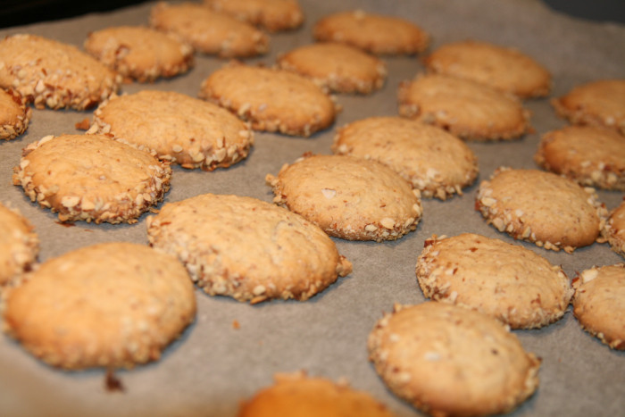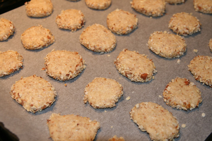 Engrave the vanilla bean and scrape the seeds. Put in the bowl the butter, the flour, vanilla seeds, almond flour, the baking powder, sugar, a pinch of salt and milk. Mix well all ingredients. Form a ball, wrap in plastic wrap and place for 2 hours to cool. Preheat oven to 180 degrees. Put the ground almonds into the pan and toast them. Grate the lemon zest and add to the ground almonds, stir well. From the dough formed discs and immerse the edge in the ground almonds. Covered baking sheet with baking paper, put on the discs and bake for about 15 min.