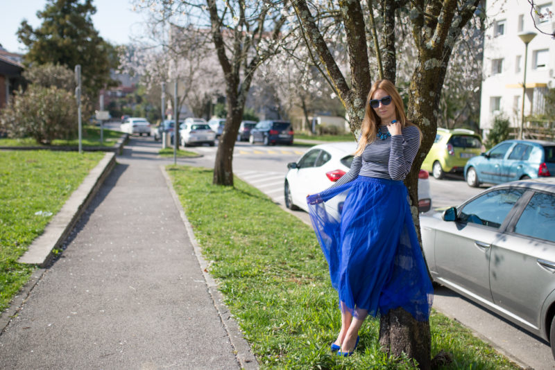 Outfit primaverile: Gonna blu in tulle e la maglia a righe