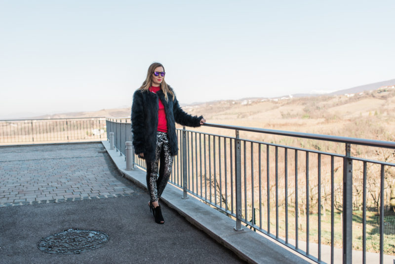 Outfit in nero e rosso con un tocco di paillettes