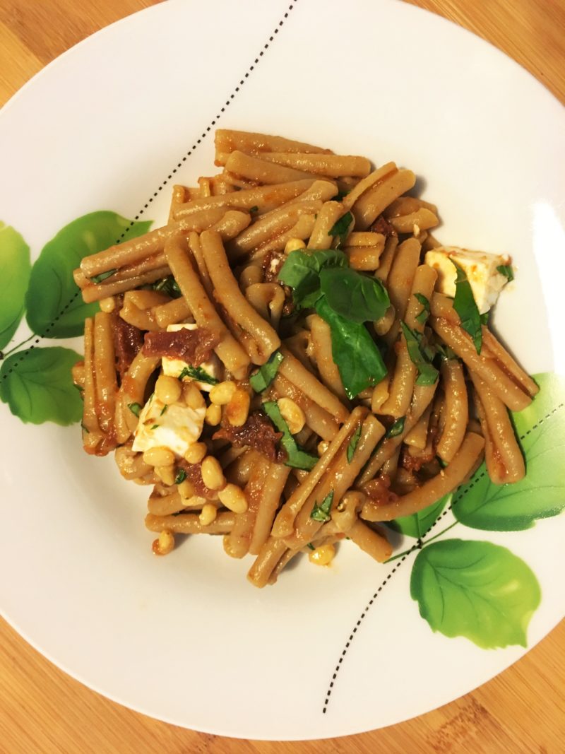 Pasta integrale con pomodori secchi, feta e basilico