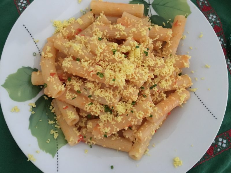 Rigatoni con crema di peperoni, robiola e il tuorlo sbriciolato