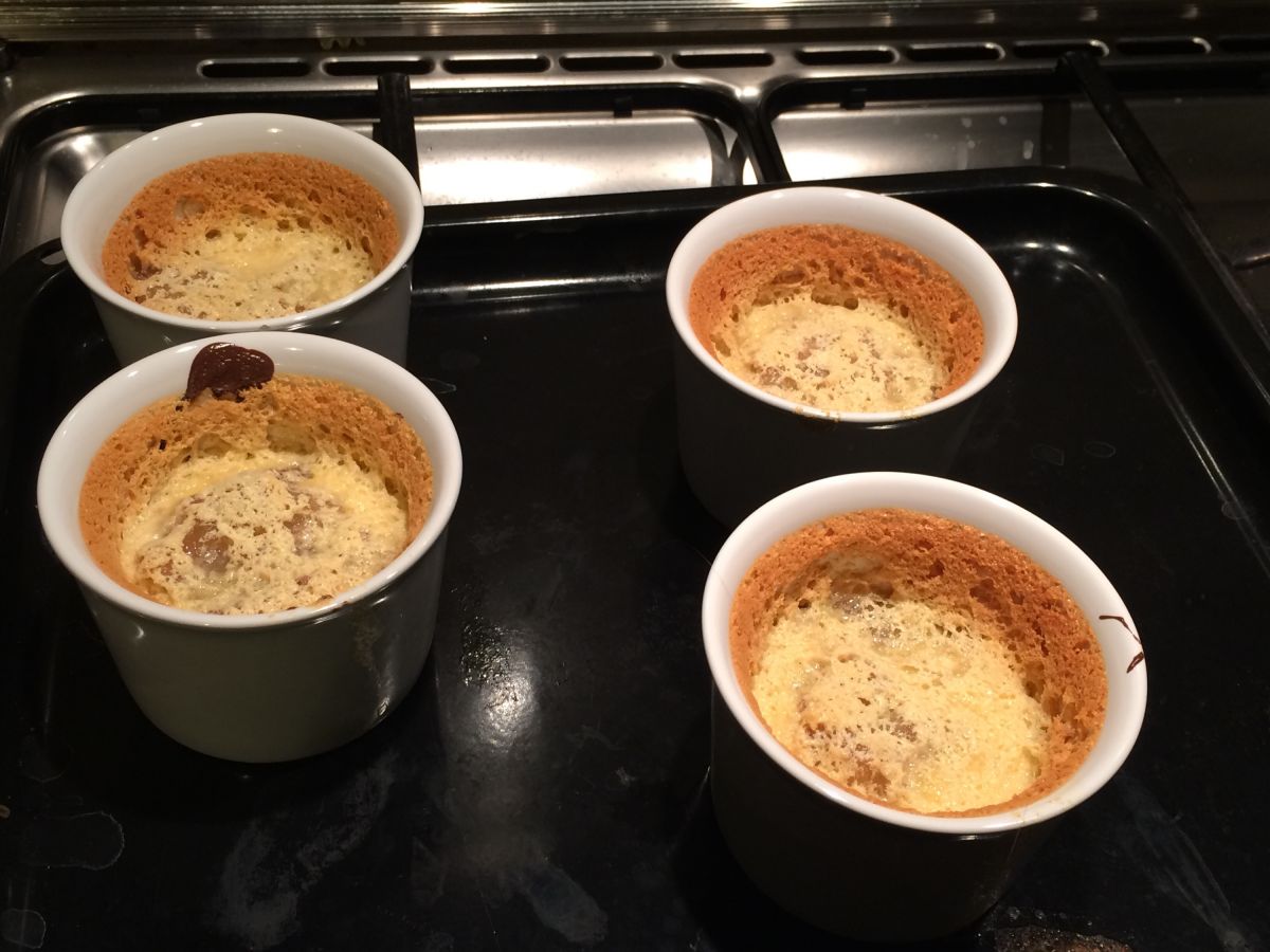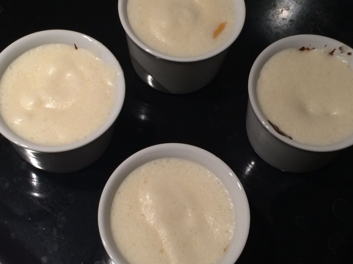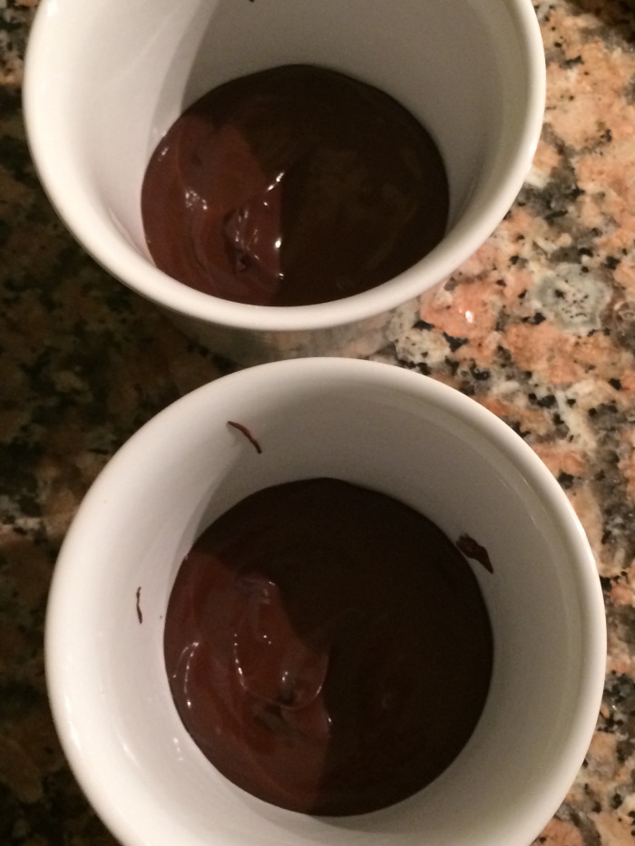 Istopite cokoladu; kada je istopljena stavite ju na dno 4 solje, a zatim staviti u hladilnik sve dok se potpuno ne ohladi. Objelite banana, isjecite ju na 1/2 cm debele kolutice, stavite u tavu i przite sa maslacom, dodajte 20 g secera i pustiti da se karameliziraju na nizkoj vatri. Ulijte vrhnje i mlijeko u lonac mjesajte dobro i pustite da provri. U zdjelu, umutiti zumanca sa preostalim secerom i kada je krema svjetl boje dodajte mlijeko sa vrhnjem. Izvadite iz hladilnikaa solje sa cokoladom i preliti sa kremom, dodajte karamelizirane banane i stavite u rernu. Postoje dva nacina za pecenje: na 90 stupnjeva za 1 sat i 30 minuta, ili stavite u tepsiju vodu i na vodu stavite solje sa cokoladom i kremom i pecite u rerni na 150 stupnjeva 15 do 20 minuta. Ostavite da se ohladi i posluzite.
