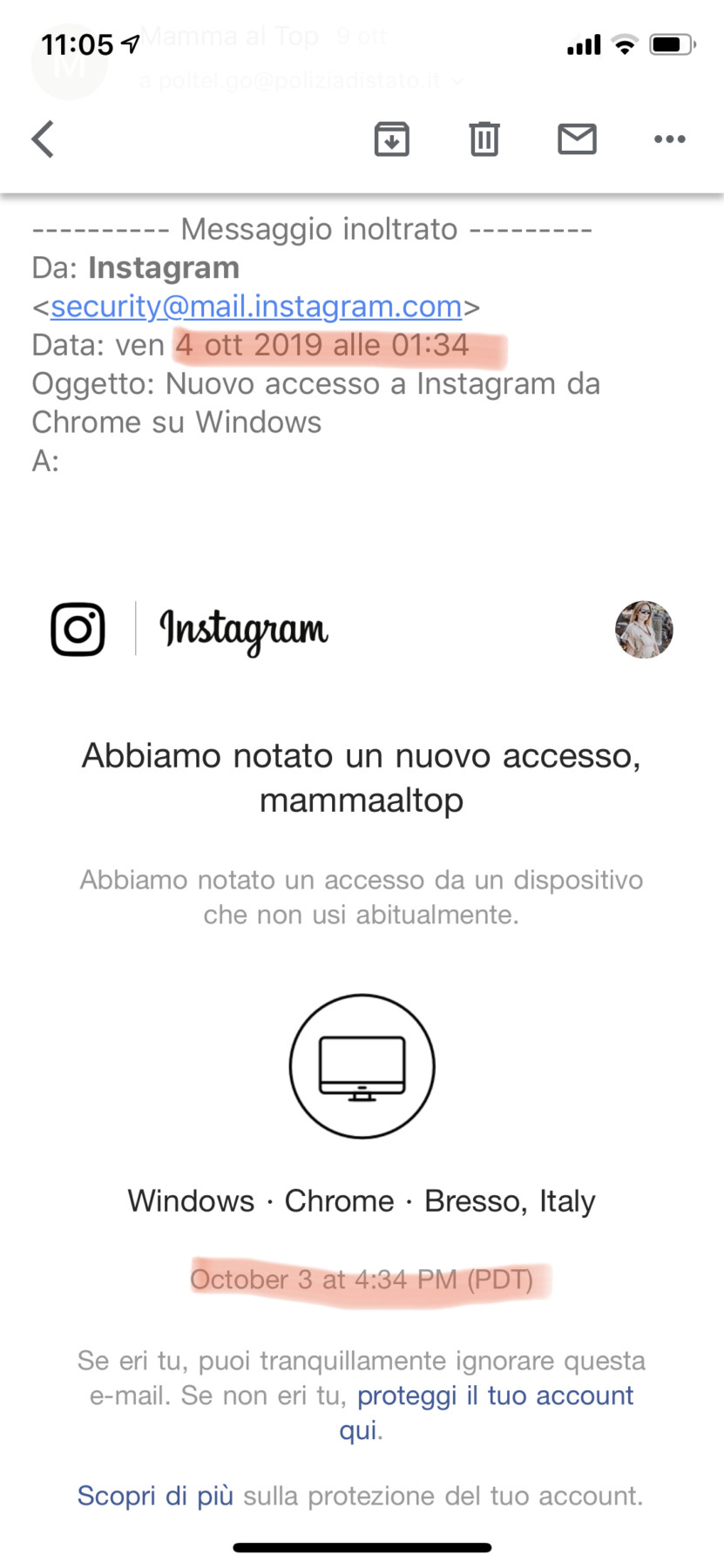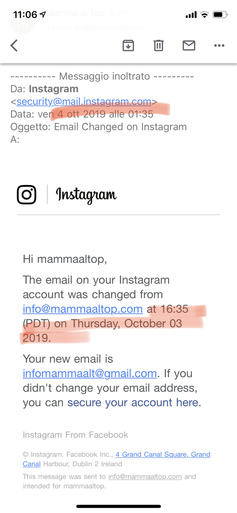 Martedì 08 ottobre sono riuscita a sentire un amico esperto in informatica e gli ho spiegato tutta la situazione. Lui, prima di tutto mi ha detto che 72 ore sarebbero scadute il giorno dopo mercoledì 09 ottobre, perché Instagram durante il weekend non fa un granché, in più mi ha avvertito sul fatto che è possibile che passino anche uno o due mesi prima che Instagram risponda, ripeto uno o due mesi L, ma come è possibile?! Prima di tutto mi ha consigliato di andare di nuovo dalla polizia postale il giorno dopo, visto che era la giornata in cui si potevano fare le denunce. Così finalmente mercoledì sono riuscita a fissare l’appuntamento con loro e sono andata a raccontare tutti i fatti. Dopo aver fatto la denuncia e la querela gli ho inoltrato tutte le mail. Hanno voluto aprire anche la mail della collaborazione sospetta e infatti i loro sistemi hanno mandato un alert che specificava che il sito NON era SICURO! Ma soprattutto andando sul link, nella barra sotto non appariva lo stesso link! Mi hanno quindi consigliato di non aprire MAI PIÙ nessun link che mi arriva sul cellulare perché questa cosa del link diverso è difficile da verificare da questo device, ma sempre dal PC. E quindi questo è il primo grande consiglio che vi do, fatelo sempre anche voi, e una parte del problema si potrebbe così già evitare dal principio.
