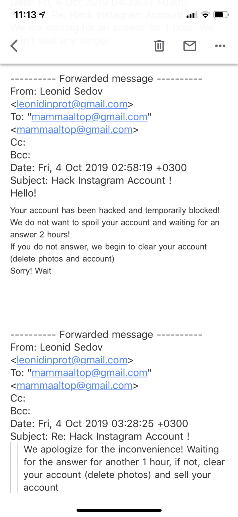 Ritorniamo a lui/lei: venerdì mattina appena vista la mail, anzi mi ha mandato ben 3 mail durante la notte, gli ho chiesto cosa volesse. Ovviamente voleva soldi, per restituirmi il mio account @mammaaltop voleva 300$ pagati in bitcoins (quindi non tracciabili) ! Per tutto il giorno di venerdì ci siamo scambiati delle mail, tipo 70/80, sì, tantissime! Io sono riuscita anche a ritrattare il prezzo ed è sceso a 200$ e ho anche provato ad allungare i tempi.