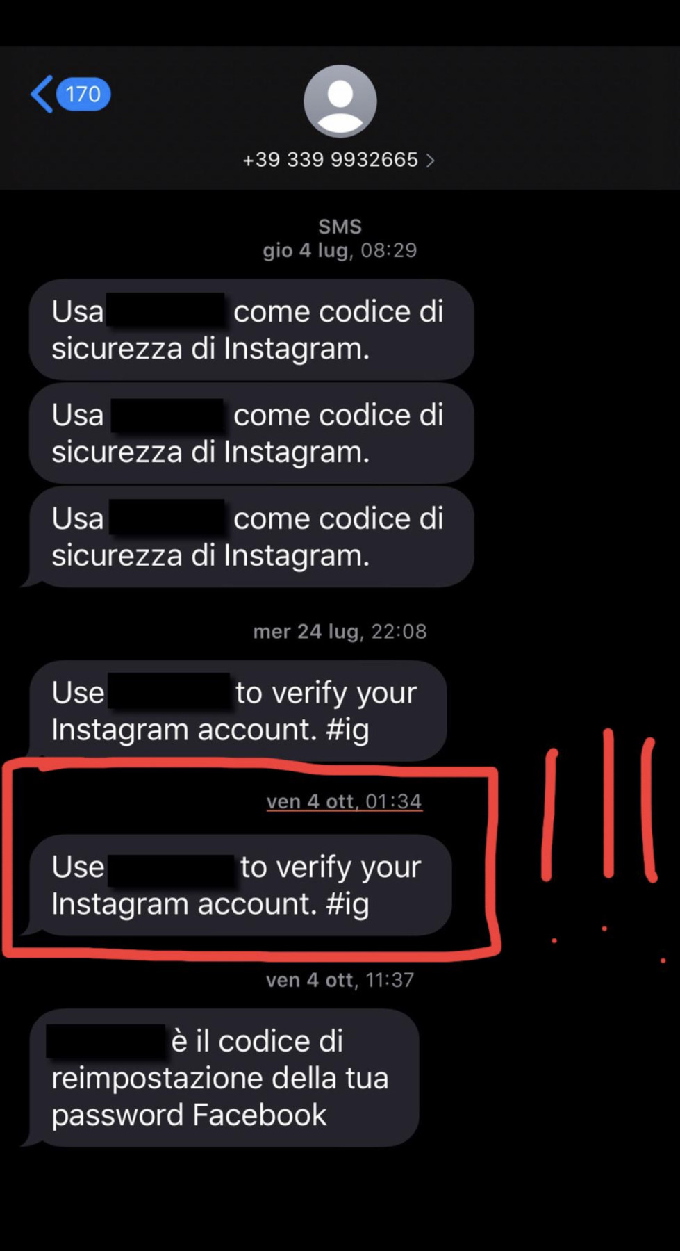 Scorro le mail e vedo che Instagram alle 01.34 di notte mi aveva mandato una mail in cui mi avvertiva che c’era stato un accesso al mio profilo da Bresso (Provincia di Milano) e un minuto dopo un’altra mail in cui mi avvertivano ancora che la mail che era collegata al mio Instagram era stata cambiata. Sì, avevo impostato la protezione a due fattori e subito sono andata a cercare il messaggio, che effettivamente era arrivato proprio all’ 1.34 di notte. Qui sotto potete vedere tutti gli screen di queste due mail e del messaggio ricevuto sul mio numero del telefono.
