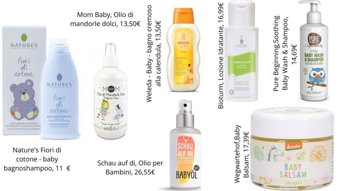 Scegliete prodotti per la cura della pelle che non irritino quella del bambino. In seguito, potete anche acquistare qualche prodotto formulato esclusivamente per la pelle e i capelli dei bambini. I prodotti Wileda sono ottimi, in particolare la lozione e lo shampoo per capelli alla calendula che detergono delicatamente e nutrono la pelle dei bimbi., così come l’olio di mandorle che protegge al massimo la cute. Un altro prodotto che va bene per i bambini è lo shampoo de L’Erbolario che è estremamente delicato per gli occhi.
