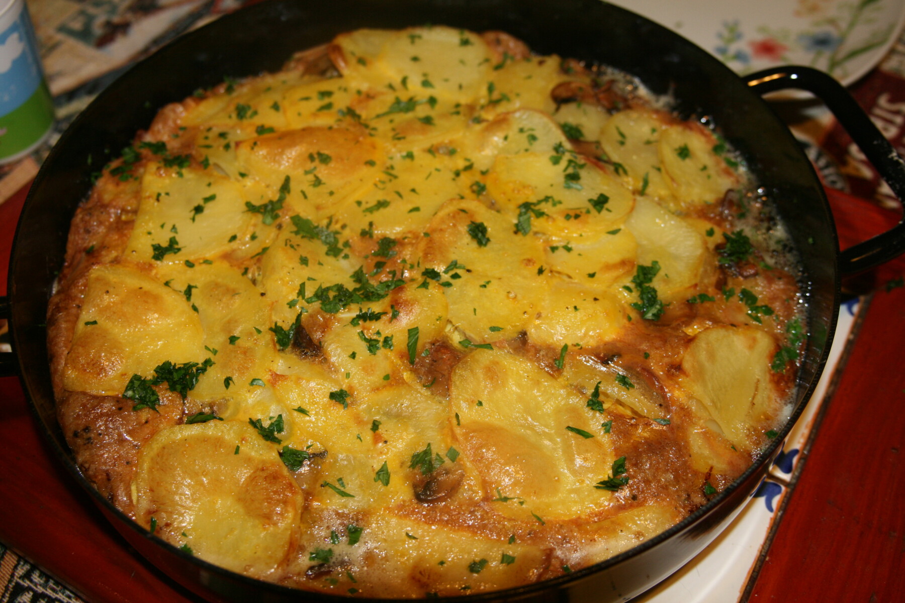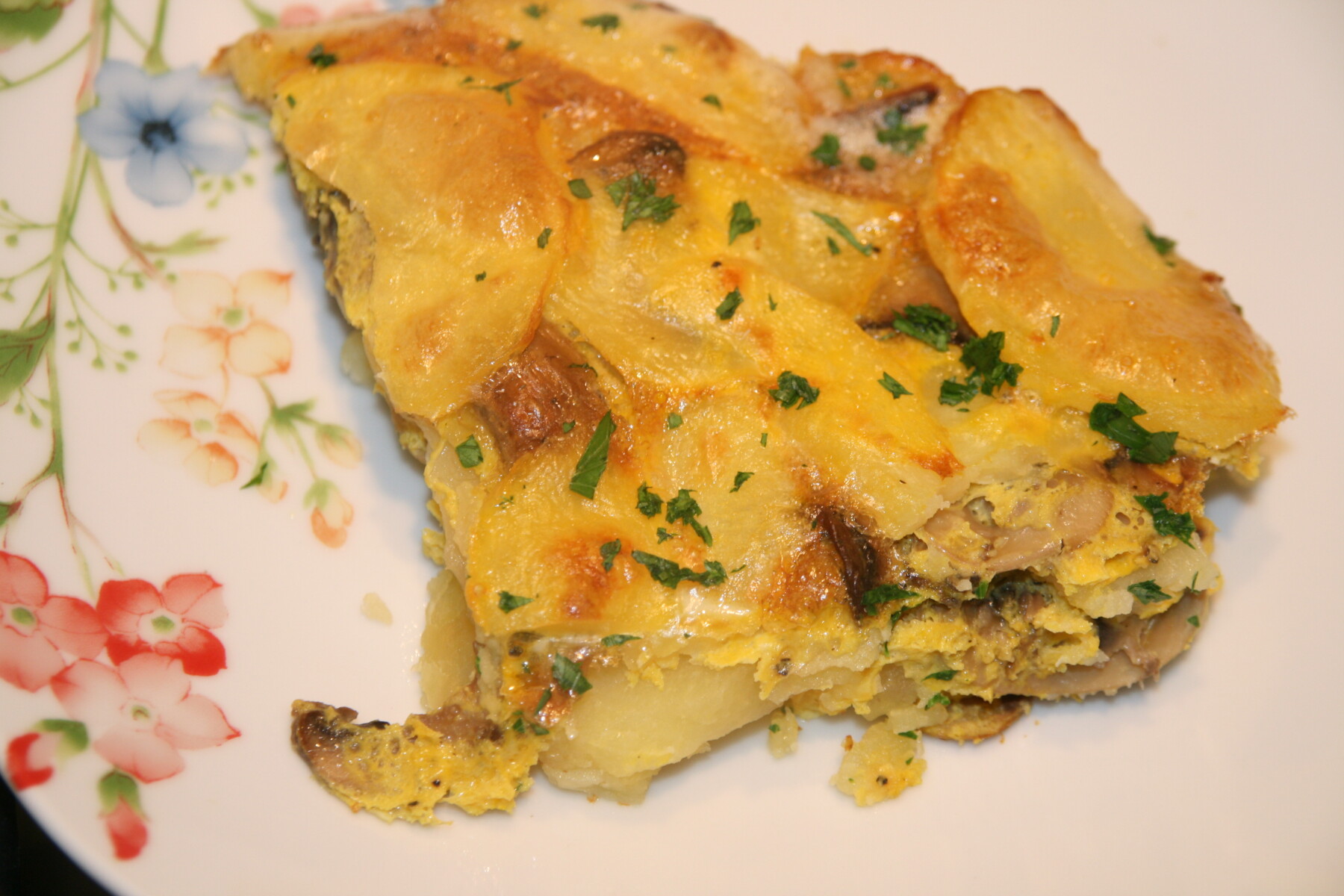 Wash the potatoes under cold running water and cook for 15 minutes after boiling in salted water. After the elapsed time, drain the potatoes and let them cool. If it is necessary peel the potatoes and cut into slices. Clean mushrooms and cut them slim. In a pan heat the oil and saute the mushrooms for 5-6 minutes over low heat. Season with salt and pepper. In a pan put down over the potatoes and mushrooms. Beat the eggs seasoned with salt and pepper and pour over the potatoes. Put the pan in the preheated oven for 25-30 minutes at 200 degrees, until you get a golden crust. When the omelette is cooked, put on the parsley and serve immediately.