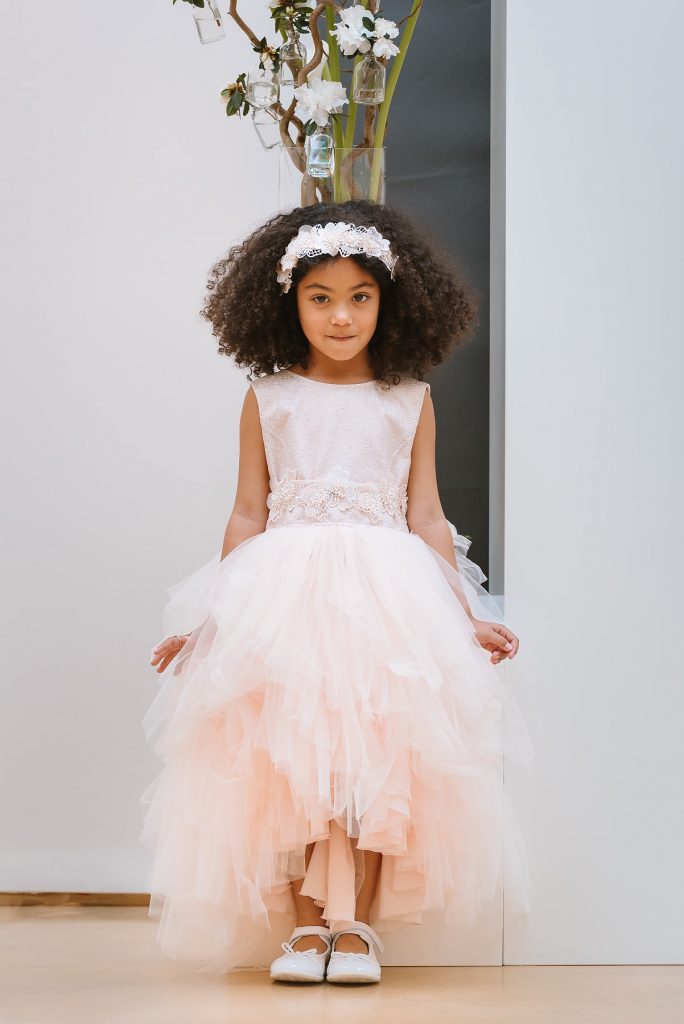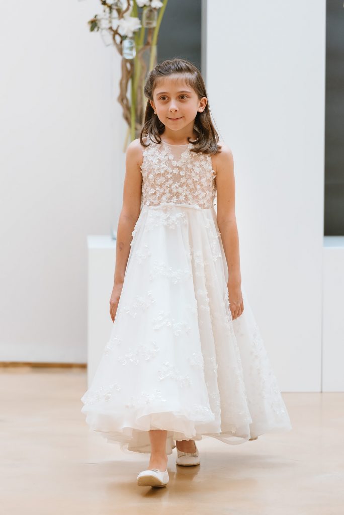 La collezione Aletta Couture (bambine 4-16 anni) per la primavera/estate 2018 è un mix di contemporaneità e sartorialità tradizionale. La molteplicità di volumi e forme, creati con abilità Made in Italy, plasmando il vaporoso tulle e il setoso georgette, trova declinazione in una vivace scala cromatica. L’equilibrio ruota attorno alle tenui note del bianco latte e rosa skin, ritmati dai dettagli mettallici gold, silver, rose gold e da tweed multicolor e micro-frange dal sapore etnico-chic. Il carattere della collezione si esprime attraverso le leggere tonalità pastellate dei colori squisitamente estivi. Le decorazioni floreali, applicate a mani con effetto tridimensionale tra strati di tulle, arricchiscono maniche, corpetti e gonne in un gioco di trasparenze, sovrapposizioni e tessuti traforati.