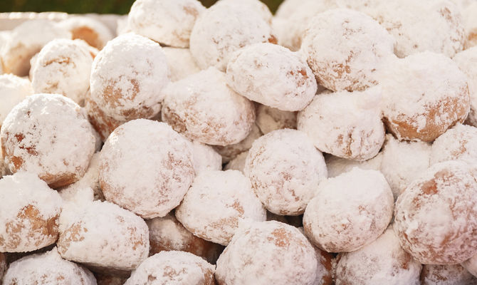 I kourabiedes o kourabiethes, pronuncia kurabiédes, sono dei biscotti tipici della Grecia realizzati con una pasta frolla leggera, di solito a base di mandorle, e sopra si sparge lo zucchero a velo. I melomakarono invece sono a forma d’uovo, fatti con la farina, olio d’oliva e miele.