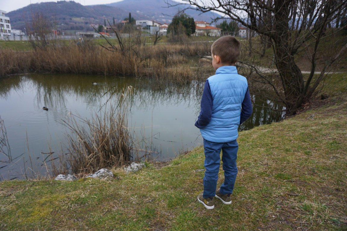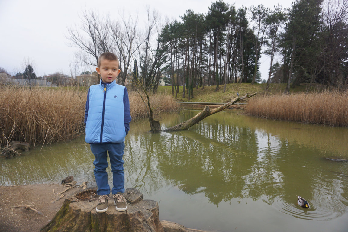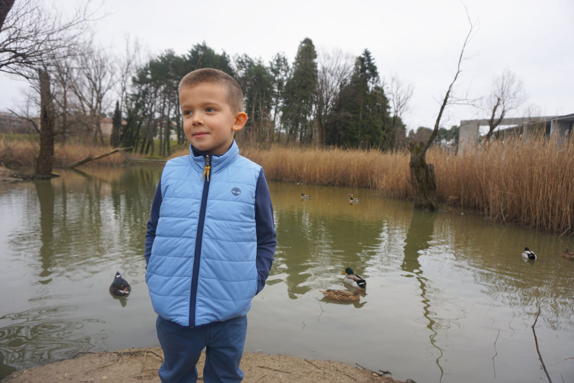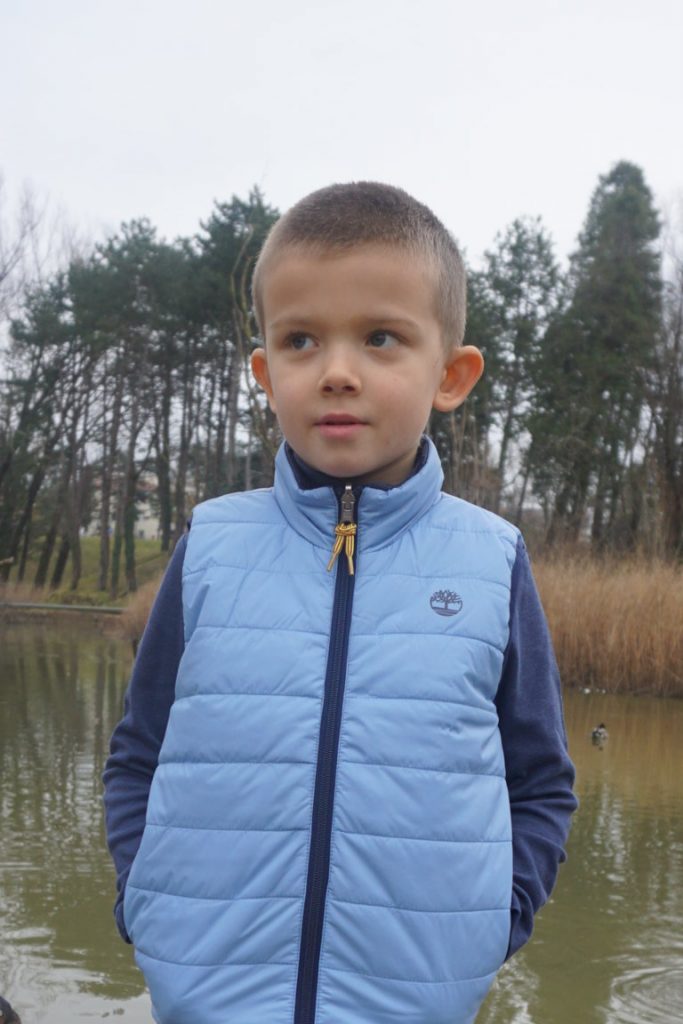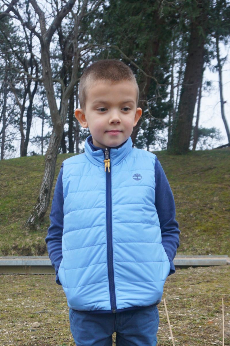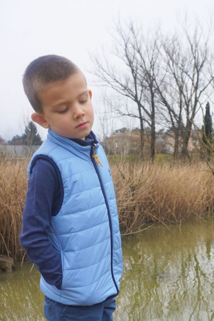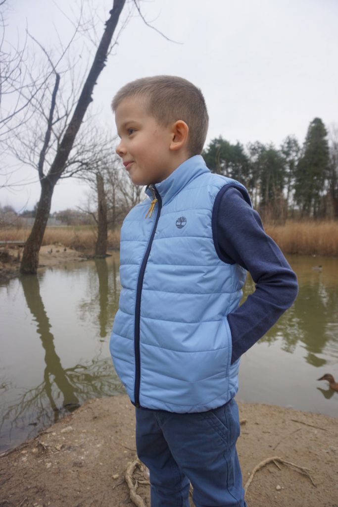 Sabato pomeriggio, anche se le nubi grigie preannunciavano il maltempo che poi è arrivato, abbiamo deciso di uscire comunque a fare una passeggiata. In Slovenia c’è un lago artificiale dove le anatre hanno trovato la loro dimora; spesso con Mario andiamo in questo posto a portare il pane alle anatre. Così anche sabato pomeriggio abbiamo deciso di portare un po’ di cibo alle amichette di Mario 🙂 Oltre alle anatre ci sono anche i piccioni dei quali Mario ha una paura tremenda, ma questa volta è riuscito a stringere amicizia anche con loro 🙂 Anzi in uno dei piccioni ha trovato anche un’assomiglianza con il nostro gatto Mickey, eh si solo Mario riesce a trovare queste assomigilianze 🙂 Tra una decina di giorni dovrebbe arrivare anche la primavera e, visto che negli ultimi giorni le temperature si sono un po’ alzate (almeno da noi), ho scelto di mettere a Mario già il giubbotto smanicato, visto che mi diceva di avere caldo. Questo tipo di capispalla lo scelgo spesso nelle mezze stagioni per mio figlio, visto che non è tanto pesante e soprattutto non lo fa sudare. Se per caso siete indecise su cosa mettere sotto il giubbotto senza maniche, tutto dipende da quanto caldo/freddo fa fuori. Personalmente opto sempre per un maglione non troppo pesante, sabato ho scelto una maglia abbastanza leggera, visto che sapevo già che Mario avrebbe corso e se gli avessi messo qualcosa di pesante avrebbe sudato di certo. Questo smanicato che vedete qui sotto è di Timberland, l’azienda statunitense che ha fatto la storia con i suoi scarponcini impermeabili in cuoio, ma ormai questo marchio è conosciuto anche per la produzione di abbigliamento per tutta la famiglia.