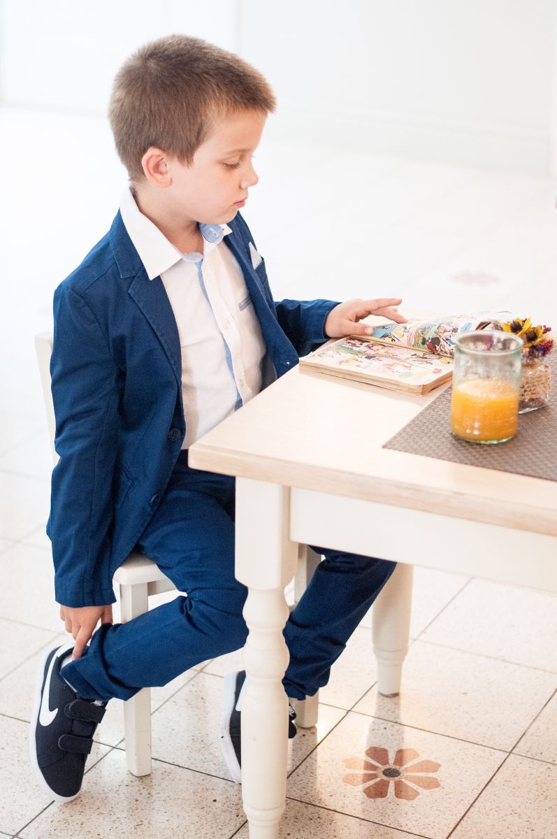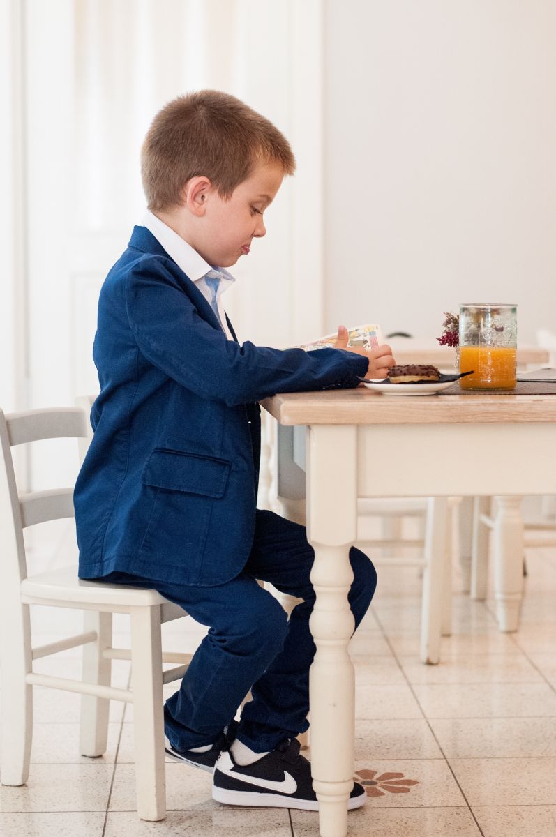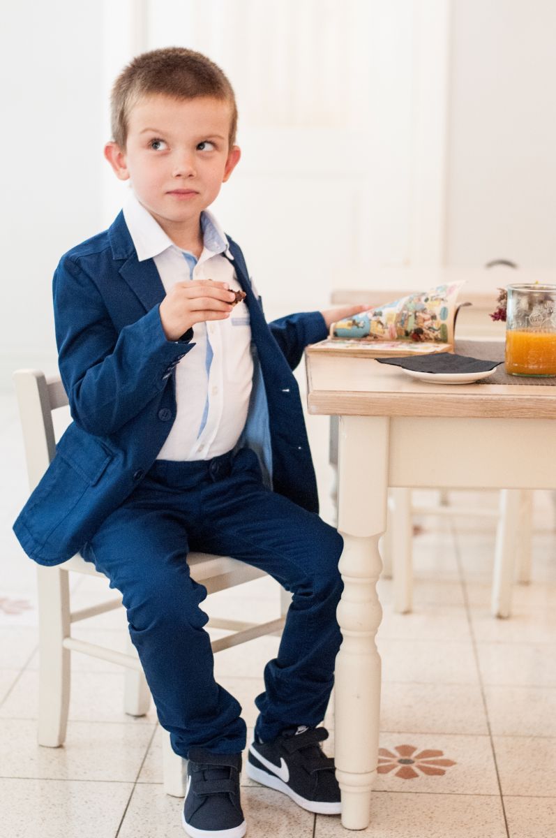 Questa volta ho scelto per lui un look elegante formato da un paio di pantaloni, camicia e giacca tutto firmato Hugo Boss. Per “sdrammatizzare” il look troppo glam ho scelto un paio di sneakers Nike. Trovo ch questo outfit sia ideale per le cerimonie, visto che siamo nella stagione dei matrimoni, battesimi e celebrazioni varie. Hugo Boss è il marchio tedesco che produce capi di alta qualità e dal design molto raffinato che veste anche il bambino da 18 mesi ai 16 anni. La giacca che indossa Mario è in cotone elasticizzato con un delicato effetto raso lucido by BOSS. Questo capo versatile è dotato di revers classico, chiusura a due bottoni e tasche con patta; è foderato con un tessuto fil-à -fil e con colore a contrasto. L’ho abbinata ai pantaloni coordinati e come camicia ne ho scelta una leggera in morbido misto cotone e lino by BOSS. Questa camicia a maniche lunghe presenta delle linguette con bottoni che consentono di risvoltare i polsini e creare un look alternativo. Siamo riusciti a finire presto questo servizio fotografico perché Mario alla fine si