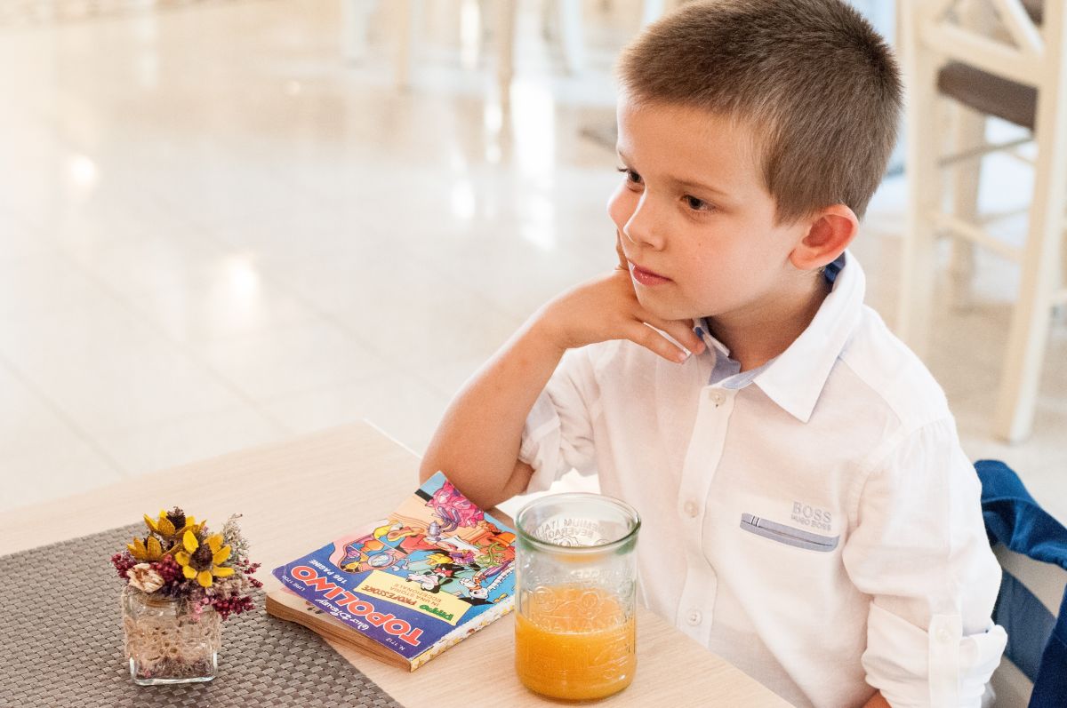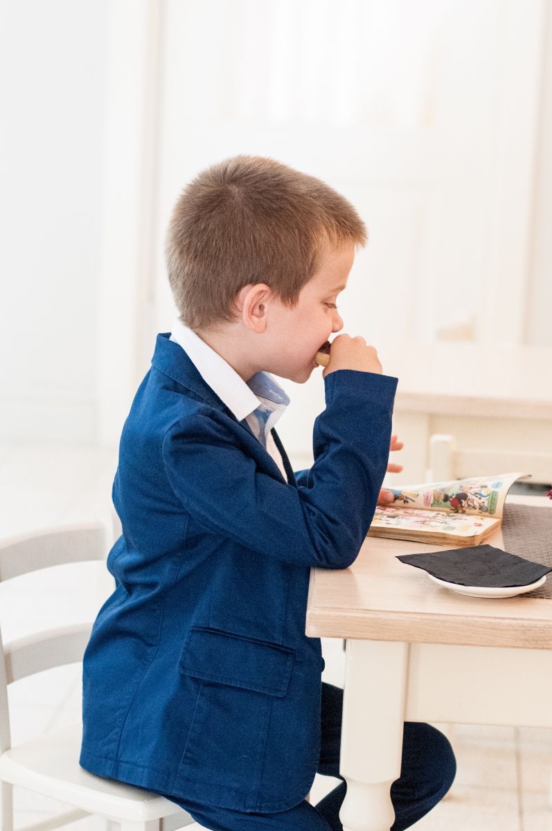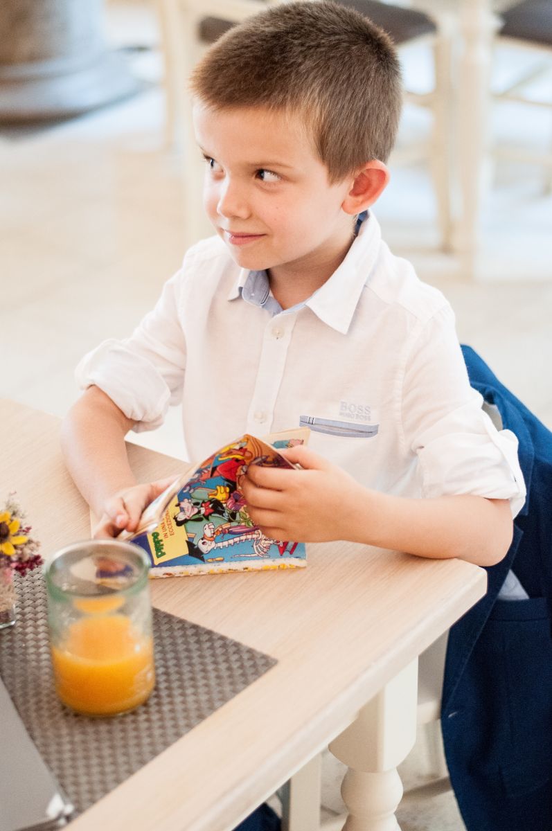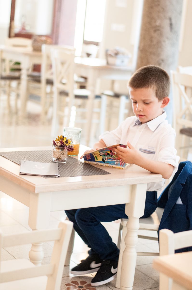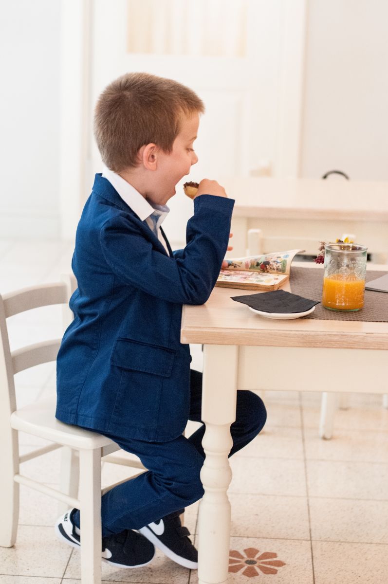 Vale lo stesso per le foto: ogni volta prima di scattare con la fotografa lo preparo, gli dico che basta ascoltarla quella mezz’ora e che poi sarà tutto finito. Una volta arrivati alla location, però, le cose cambiano 🙂 Mario vuole giocare, fa le faccine oppure non sta fermo nemmeno 5 sec per scattare una foto! Ormai la nostra fotografa di fiducia conosce bene Mario e sa riconoscere se ha una giornata si o una giornata no 🙂 Dopo un anno che ci affidavamo a lei per le foto, una volta abbiamo cambiato fotografa anticipandole un po’il carattere di Mario. Essendo preparata,alla fine ha deciso di scattare le foto all’interno di un bar. Una scelta vincente visto che c’era anche un angolo per bambini in cui Mario si è sentito subito a suo agio. In più, al bar vendevano anche le ciambelle alle quali Mario non è riuscito a resistere, tanto che durante il servizio fotografico ne ha mangiato ben due!