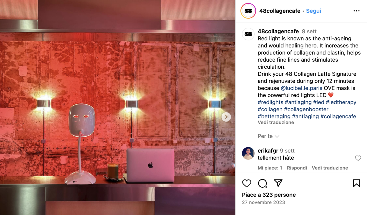 La lampada/maschera LED Ove, a luce rossa, la cui sessione di 12 minuti è offerta al momento dell’acquisto di una grande bevanda, permette di fare un boost di collagene in un’atmosfera accogliente e rilassante. in effetti è il luogo ideale per un attimo di relax dopo una giornata trascorsa tra le vie di Parigi o per iniziare la serata più “distesa”. 48 Collagen regala ai clienti un aspetto fresco e radioso.