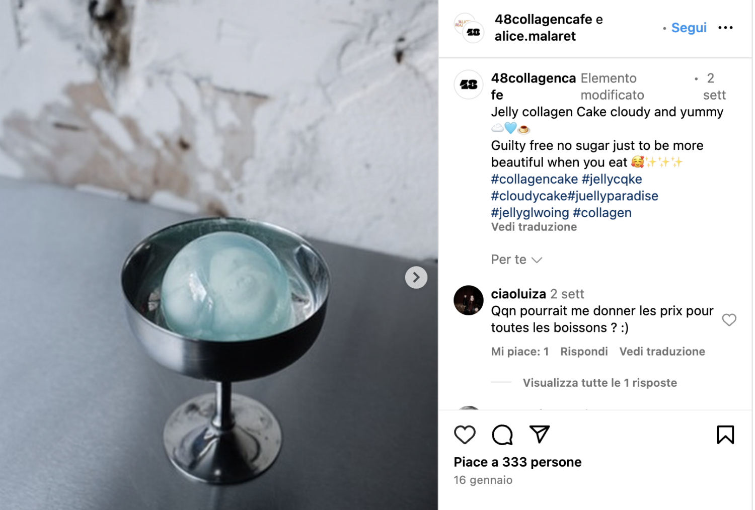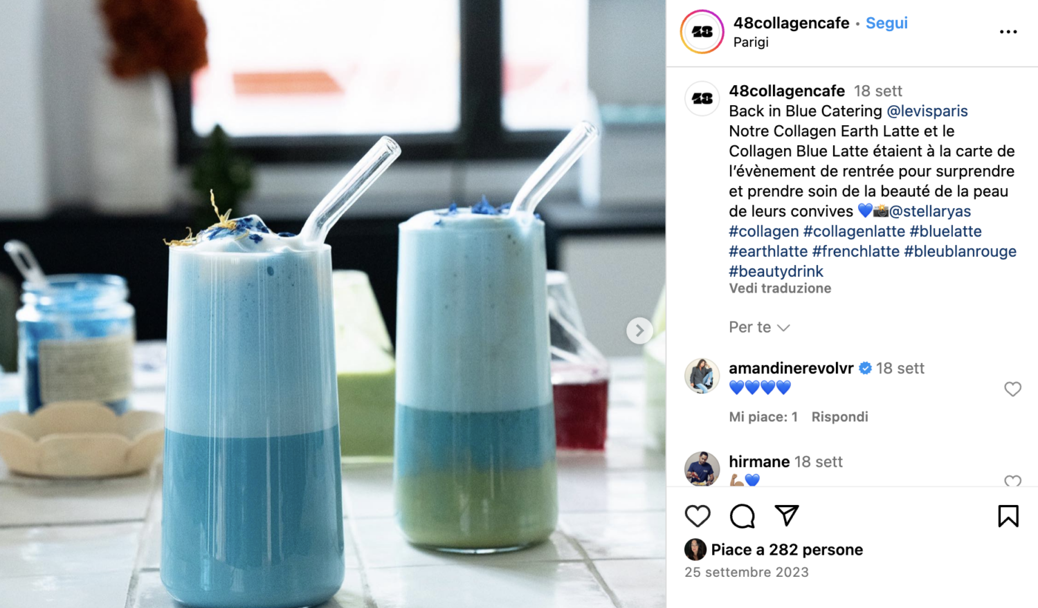 Situato nel cuore del 9° arrondissement, 48 Collagen ha rapidamente guadagnato popolarità grazie alla sua proposta innovativa di bevande e trattamenti arricchiti con collagene, la proteina essenziale per la salute della pelle, delle unghie e dei capelli. Il bar è diventato il ritrovo preferito per chi è alla ricerca di un approccio diverso alla bellezza e al benessere. I benefici del collagene sono ampiamente noti in ambito medico e cosmetico. Questa proteina è fondamentale per mantenere la pelle giovane, elastica e idratata. Sicuramente l’idea di consumare il collagene non è nuova, ma 48 Collagen è il primo concept a Parigi a creare un’esperienza dedicata a questo elemento chiave della bellezza.