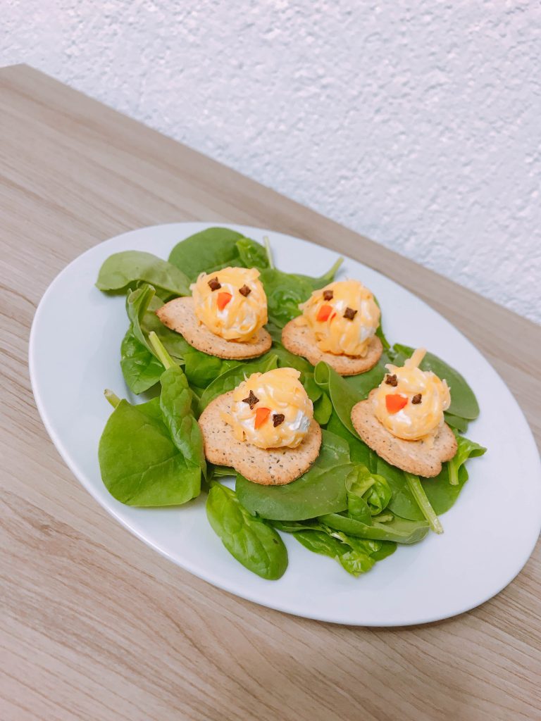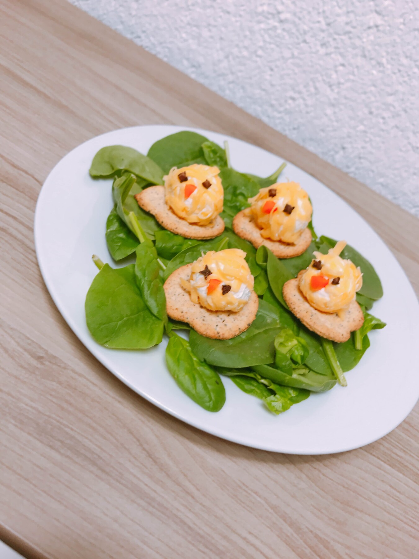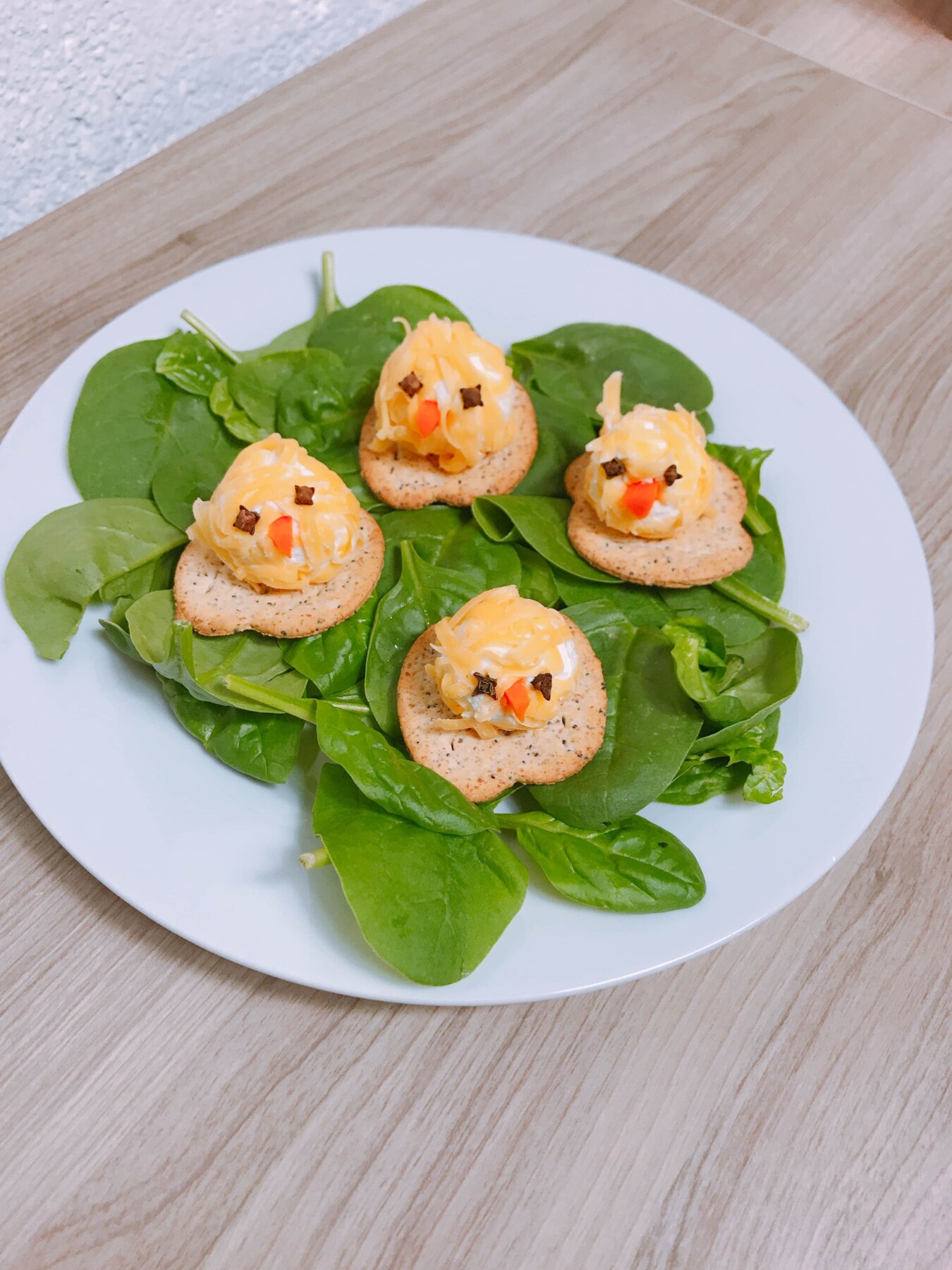 Ammorbidite la Philadelphia con una forchetta ,formate delle palline e passatele nel formaggio grattugiato Cheddar. Lavate e pelate la carota. Tagliatela a piccoli pezzi, con i quali farete il naso. Sulla palla di formaggio posizionate il naso e gli occhi con i chiodi di garofano. Posizionate le palline di formaggio sui crackers, ed ecco i pulcini sono pronti per essere gustati.