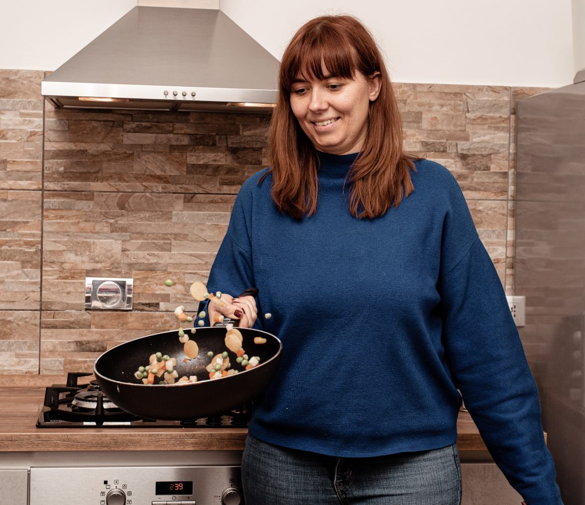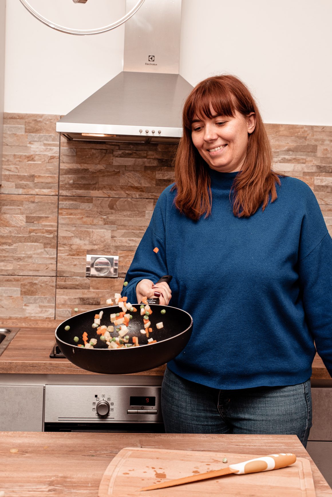 Nel wok riscaldato vengono aggiunti solo gli ingredienti che richiedono più tempo per la cottura (es. carne, verdure dure), seguiti da quelli veloci da preparare (es. verdure a foglia, erbe aromatiche). Mescoliamo costantemente gli ingredienti in modo che non si attacchino.