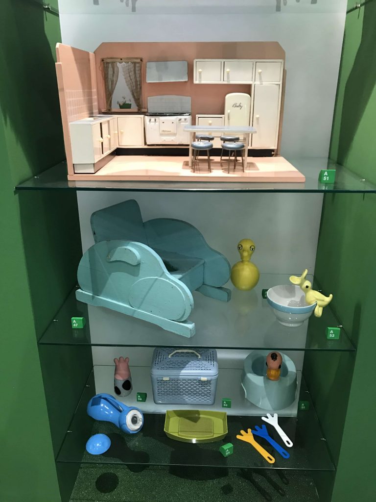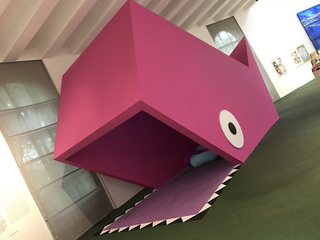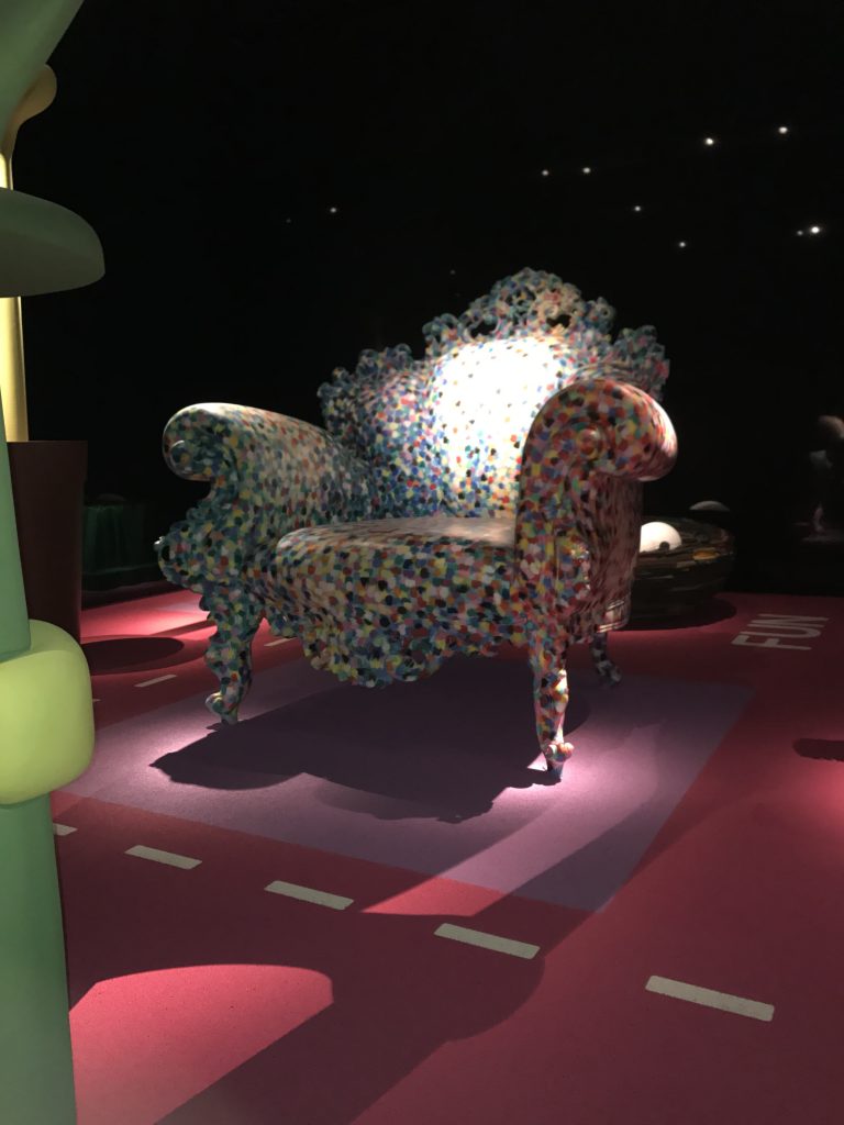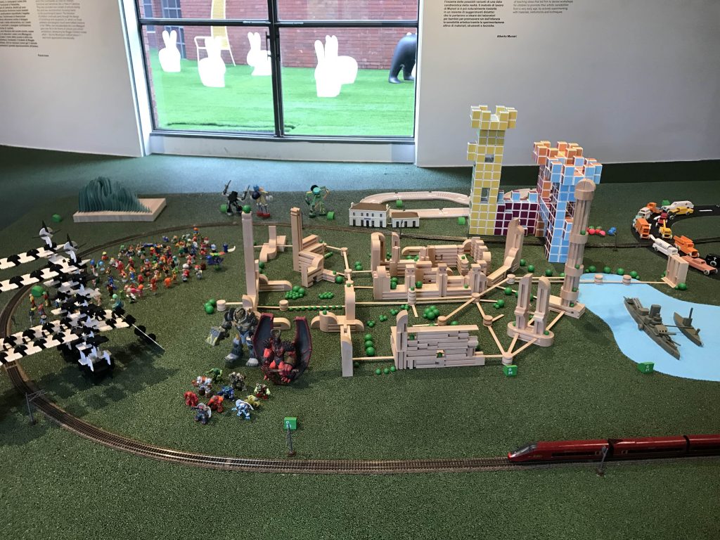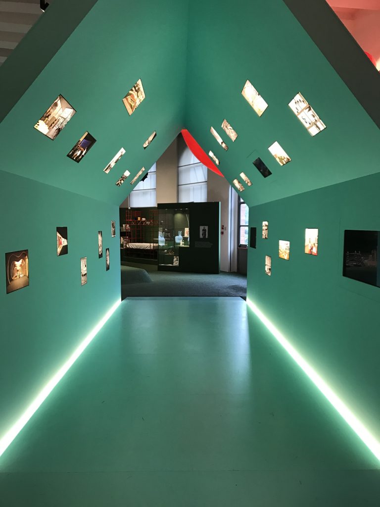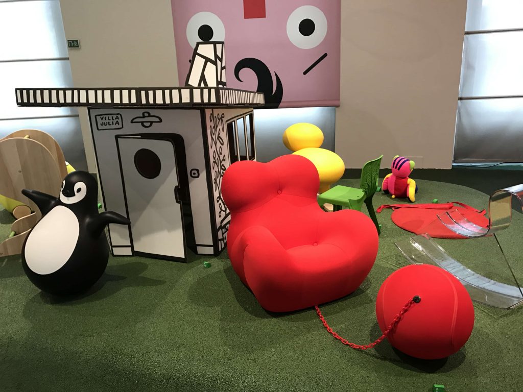 Ho visitato la mostra una decina di giorni fa e già l’entrata prometteva bene. Dietro a tutto ciò c’è il direttore artistico Stefano Giovannoni, che ha pensato bene di fare l’ingresso sul naso del personaggio furbetto di Quadratino ( Quadratino, personaggio inventato nel 1910 da Antonio Rubino ). Una volta entrata, mi sono trovata in una sala semi buia, dove mi sono sentita come se fossi entrata in una fiaba. La mostra è divisa in sei sezioni che sono tematiche; “Arredi” a cura di Maria Paola Maino; “Giochi” curata da Luca Fois con Renato Ocone; “Architetture” di Fulvio Irace; “Segni” a cura di Pietro Corraini; “Animazioni” di Maurizio Nichetti, e “Strumenti” a cura di Francesca Balena Arista.