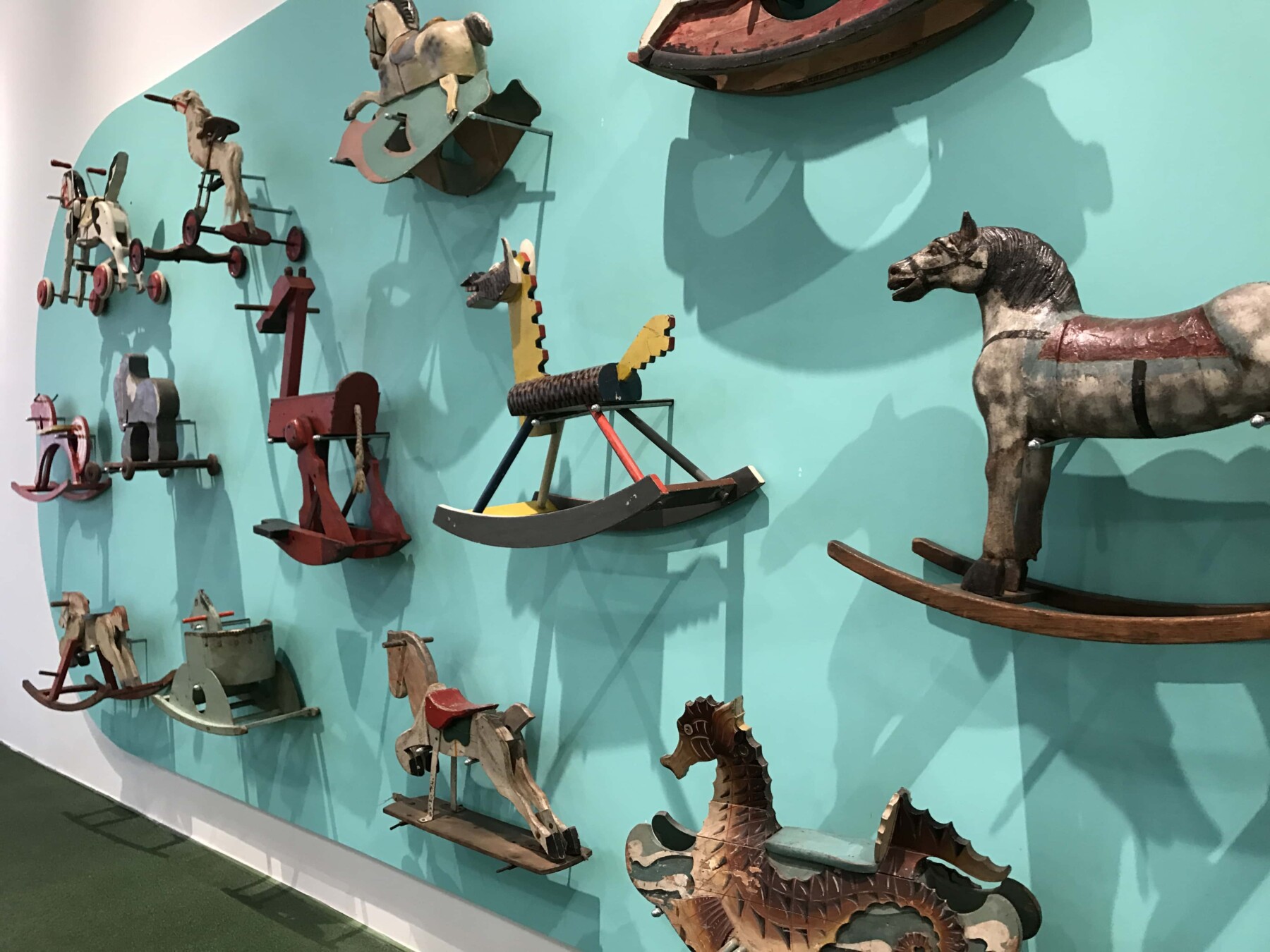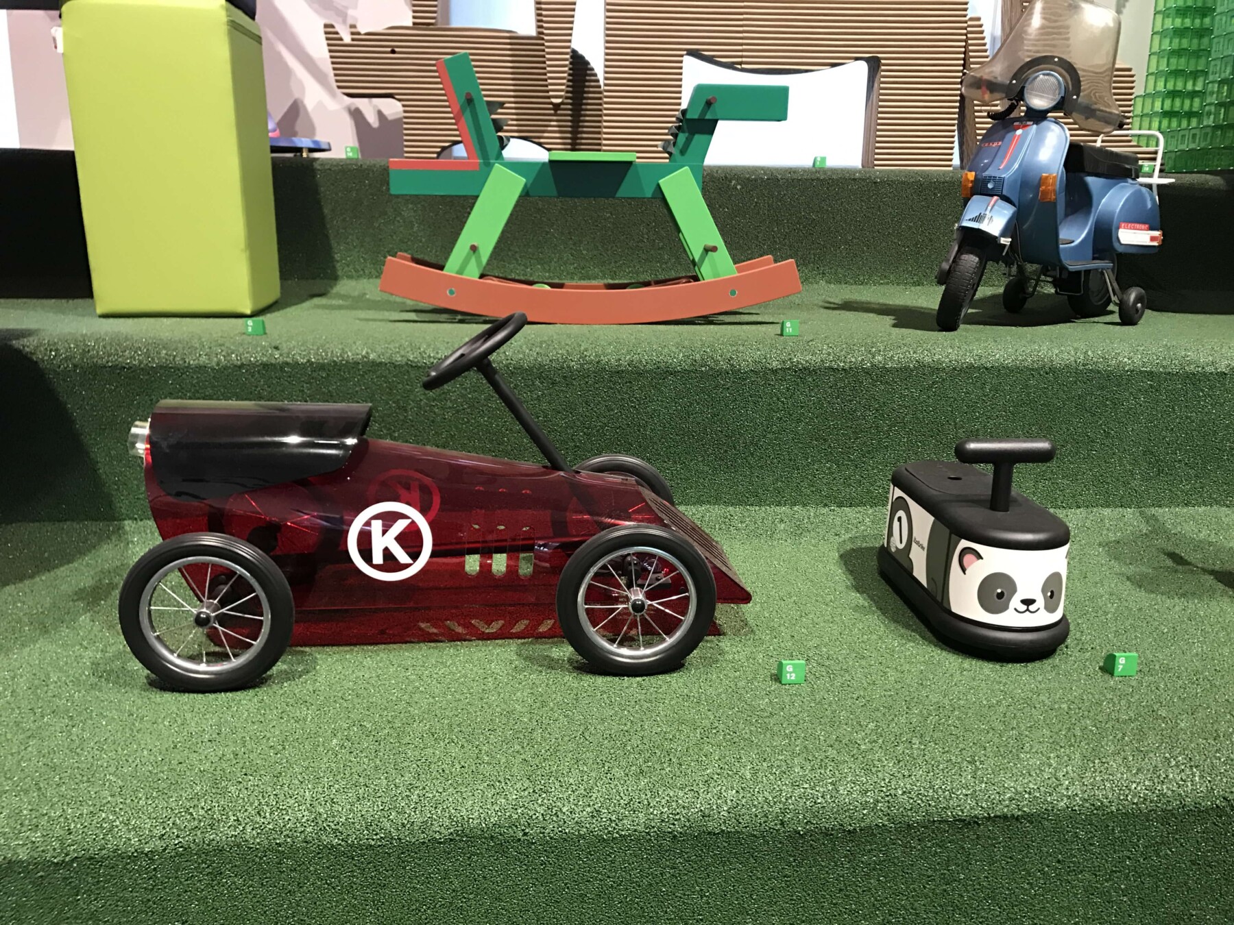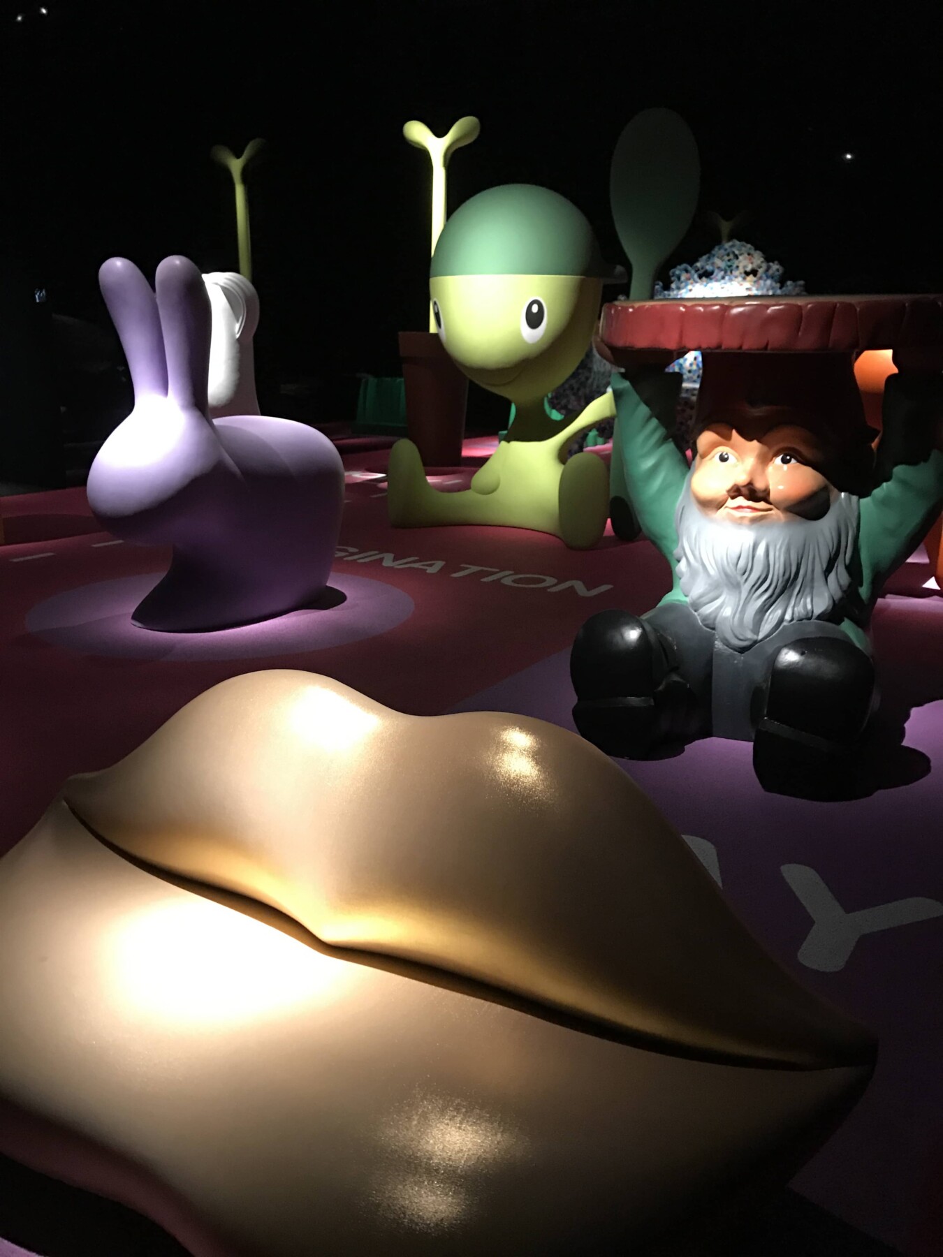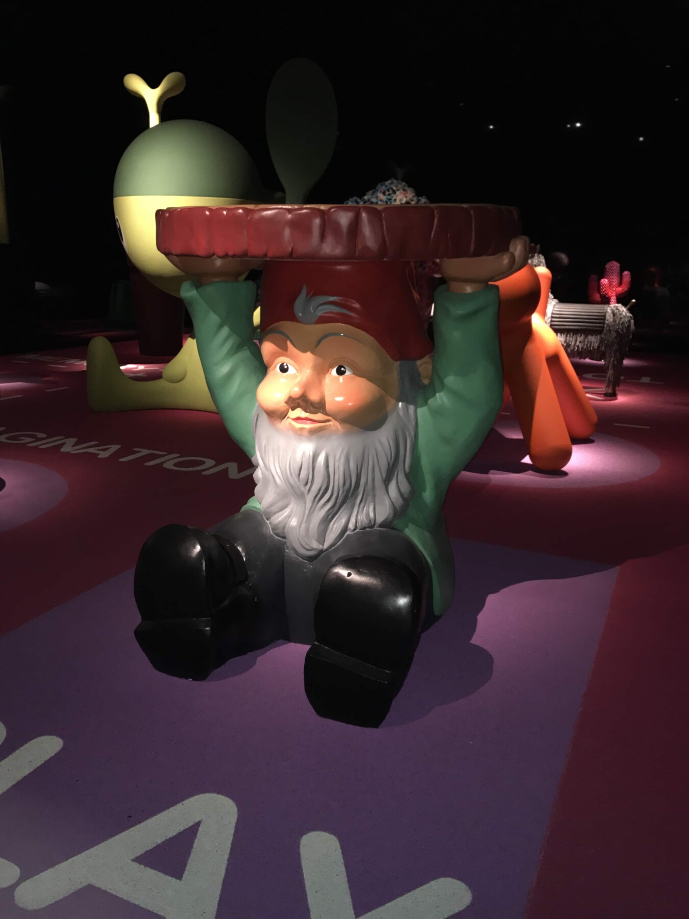 Ho visitato la mostra una decina di giorni fa e già l’entrata prometteva bene. Dietro a tutto ciò c’è il direttore artistico Stefano Giovannoni, che ha pensato bene di fare l’ingresso sul naso del personaggio furbetto di Quadratino ( Quadratino, personaggio inventato nel 1910 da Antonio Rubino ). Una volta entrata, mi sono trovata in una sala semi buia, dove mi sono sentita come se fossi entrata in una fiaba. La mostra è divisa in sei sezioni che sono tematiche; “Arredi” a cura di Maria Paola Maino; “Giochi” curata da Luca Fois con Renato Ocone; “Architetture” di Fulvio Irace; “Segni” a cura di Pietro Corraini; “Animazioni” di Maurizio Nichetti, e “Strumenti” a cura di Francesca Balena Arista.