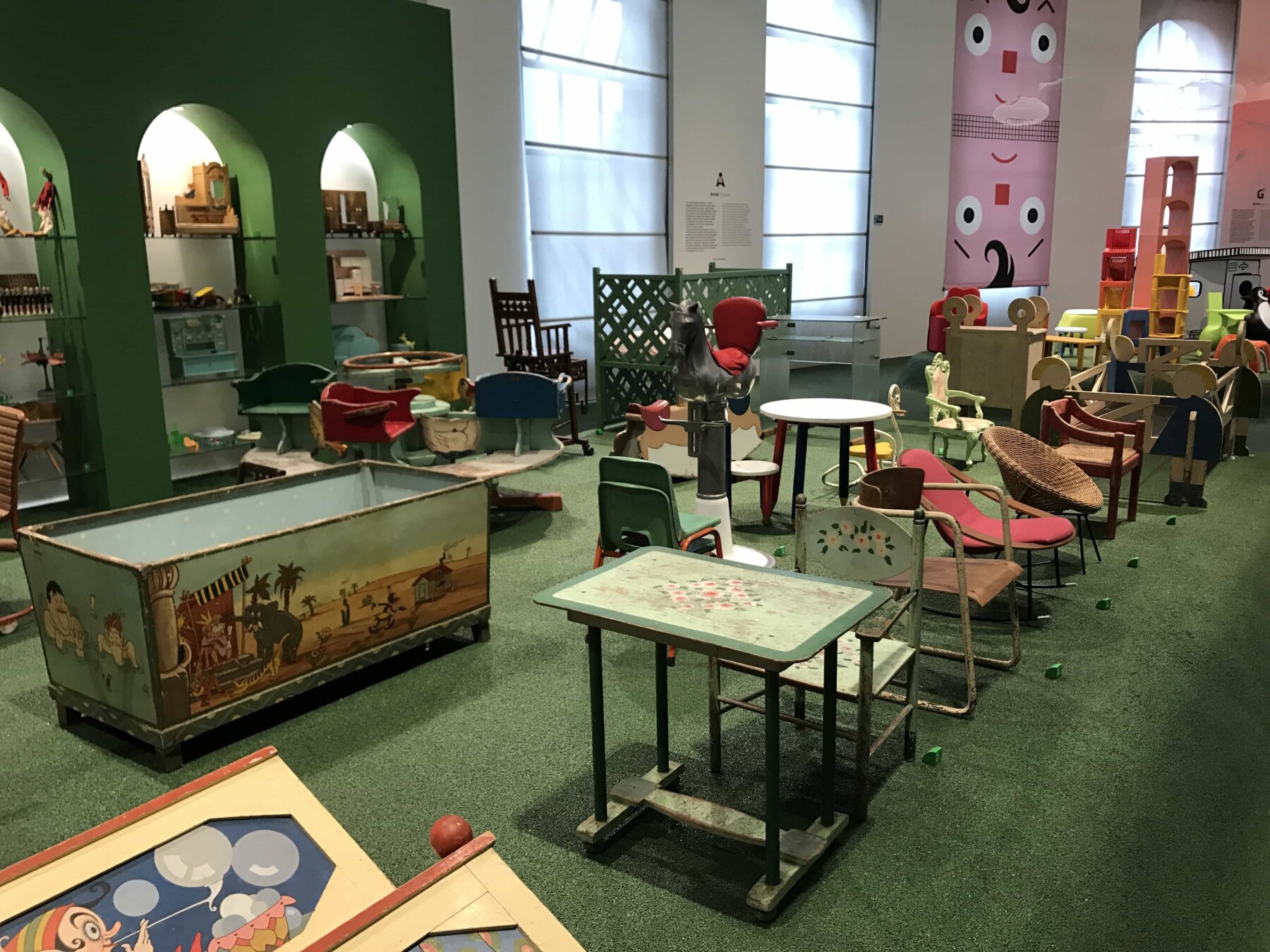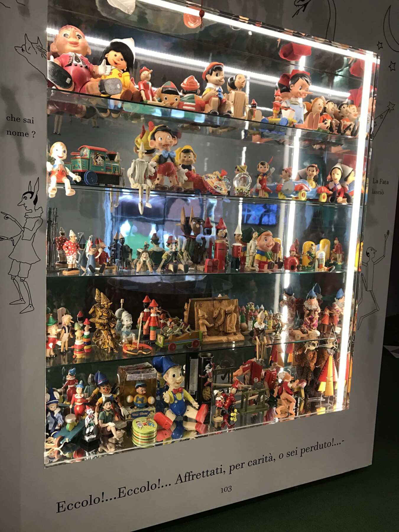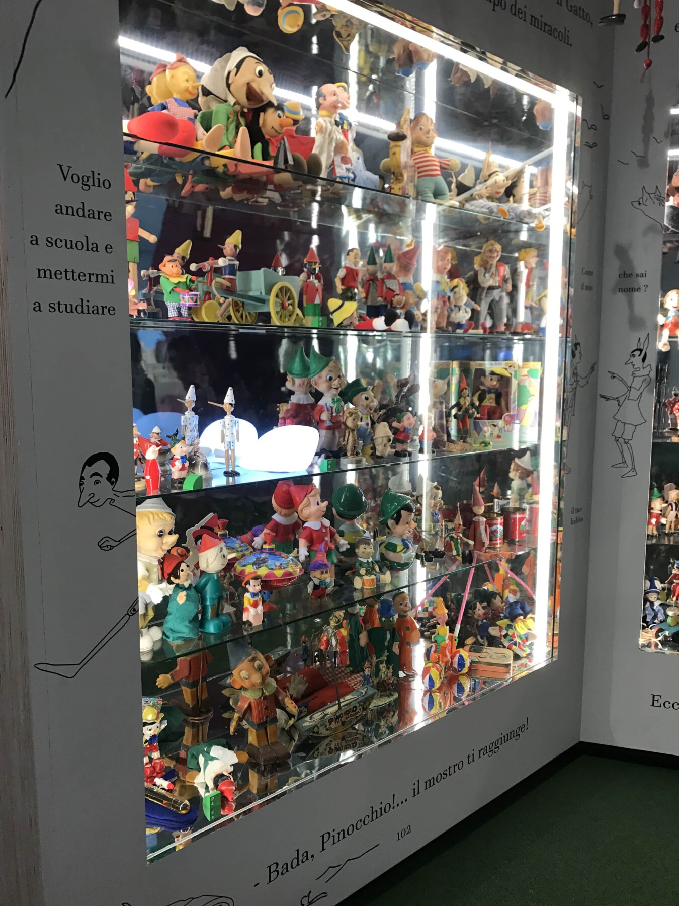 Tra gli arredi di una volta, cavallini a dondolo e vari giochi ormai dimenticati, si arriva ad una vetrina grande dedicata a Pinocchio. Si possono ammirare tantissimi burattini in legno e plastica che a tutti noi fanno ricordare la famosa favola di Carlo Collodi. Di sicuro non può passare inosservata la balena rosa gigante, dove all’interno ci si può sedere e guardare i cartoni animati. Ma i bambini si possono fermare anche nella area dei libri fino ad arrivare allo spazio dove possono divertirsi con il lego e dove possono svagarsi.