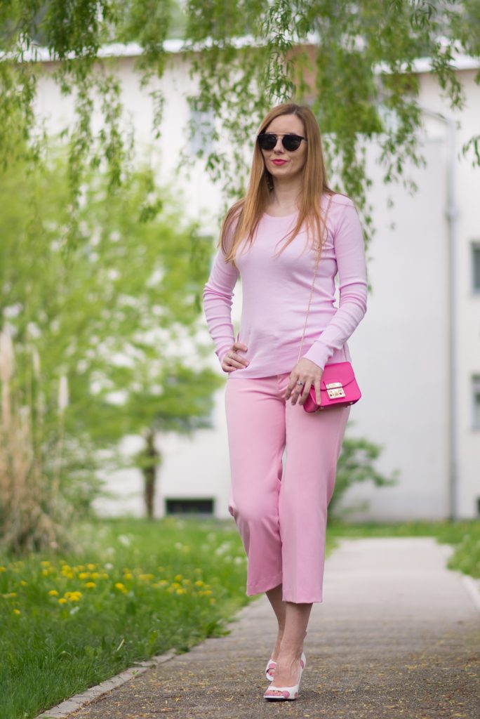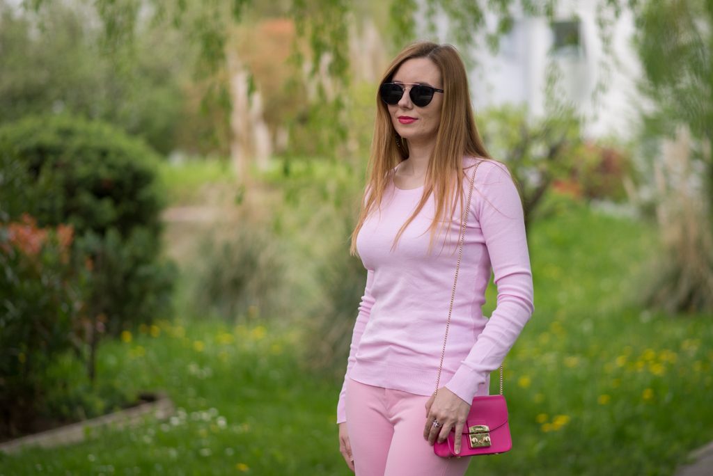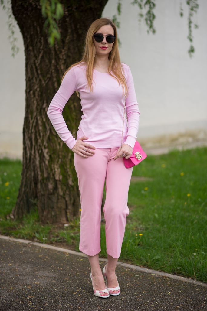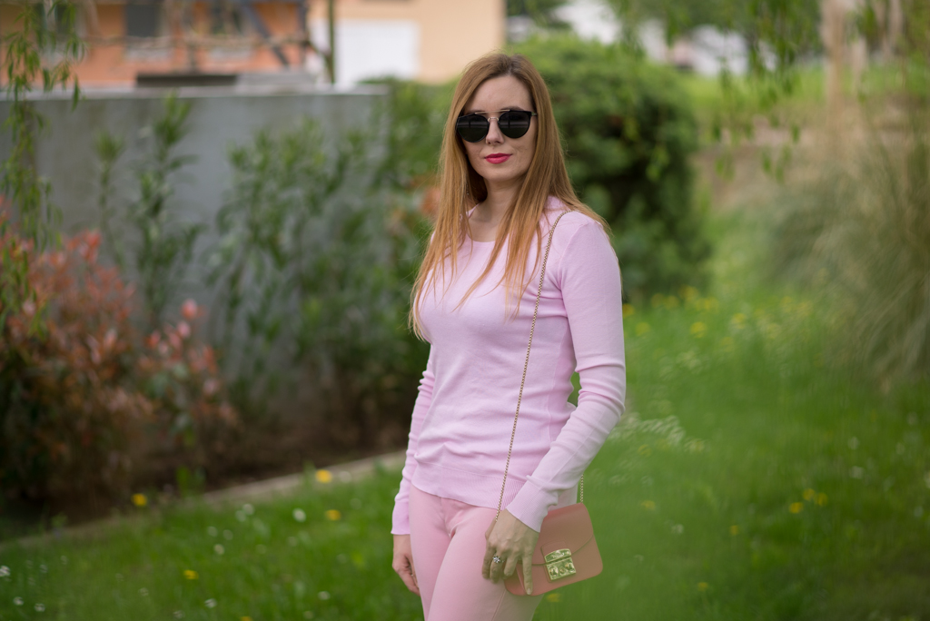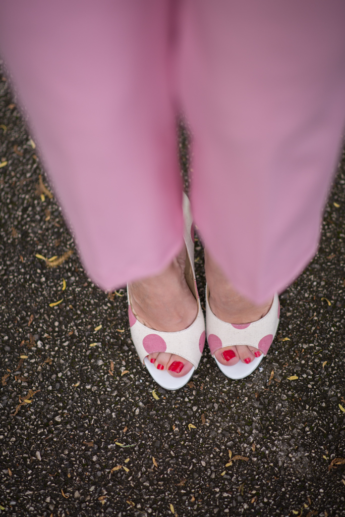 Come potete vedere qui sotto io ho osato e ho deciso di indossare un paio di pantaloni rosa abbinandoli alla maglia della stessa tonalità. A questo look ho abbinato una borsetta color fucsia e le scarpe spuntate bianche a pois rosa firmate Daniele Amato. Pensate che questo giovanissimo stilista borse ha incantato niente di meno che Manolo Blanik con la collezione di scarpe.