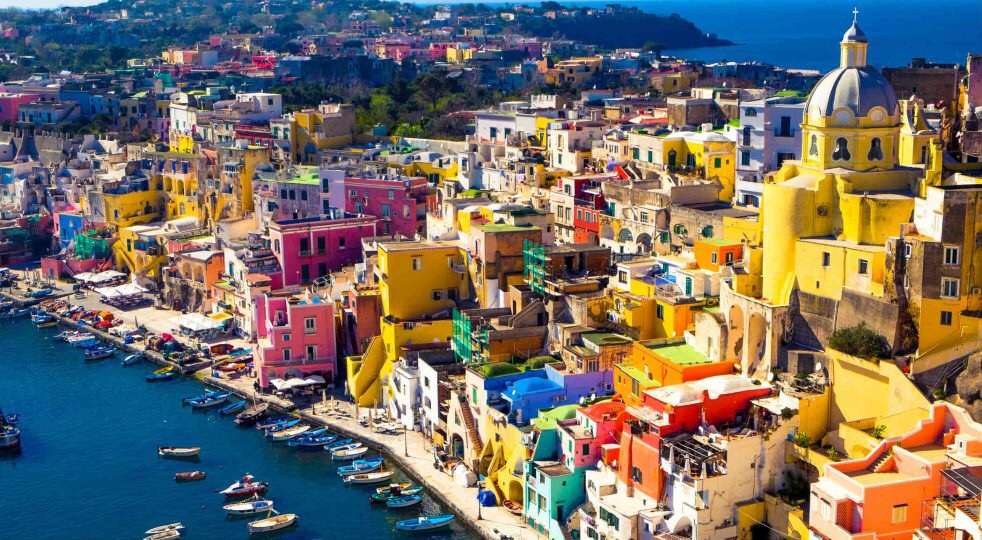 Quest’isola si trova a pochi chilometri da Napoli e appartiene al gruppo delle isole Flegree. Procida, come tutto quello che c’è nei dintorni, ha una lunga e ricca storia dove oggi vivono circa dieci mila persone. Assolutamente da visitare: il borgo Corricella dove hanno girato nel 1994 il famoso film Il Postino, ma anche Mr. Ripley (1999). Da qui potete ammirare il panorama e, naturalmente, passare le vostre giornate in spiaggia.