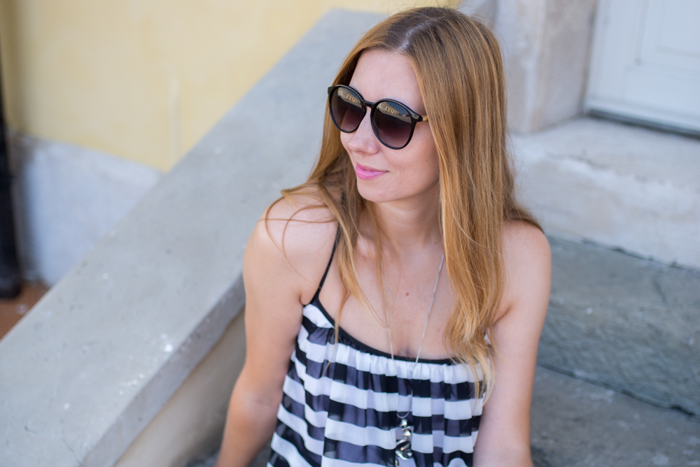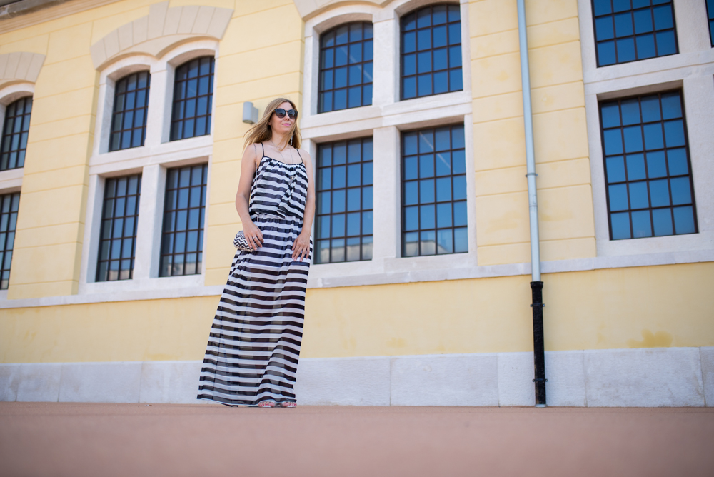 Invece, parlando del mio look di oggi, si torna a Trieste nel Porto Vecchio, dove quest’estate abbiamo scattato con Katja queste foto. Nel Porto Vecchio si trovano ancora gli edifici ottocenteschi che sono chiusi da anni. Alcune aree sono state restaurate e ci sono degli edifici nuovi che stanno facendo rivivere questa area un pò abbandonata. Avevo scelto già questa location per un altro look, lo potete vedere QUI. Invece il look che vedete qui sotto è un abito lungo a righe. Sapete già quanto io ami le righe e che ormai le indosso in tutte le stagioni . Ma quando ho visto questo abito lungo di Almagores l’ho dovuto prendere. L’avevo indossato già in varie occasioni ed è molto pratico e leggero. Senza i tacchi però non lo posso portare, perchè è troppo lungo anche per me .🙂
