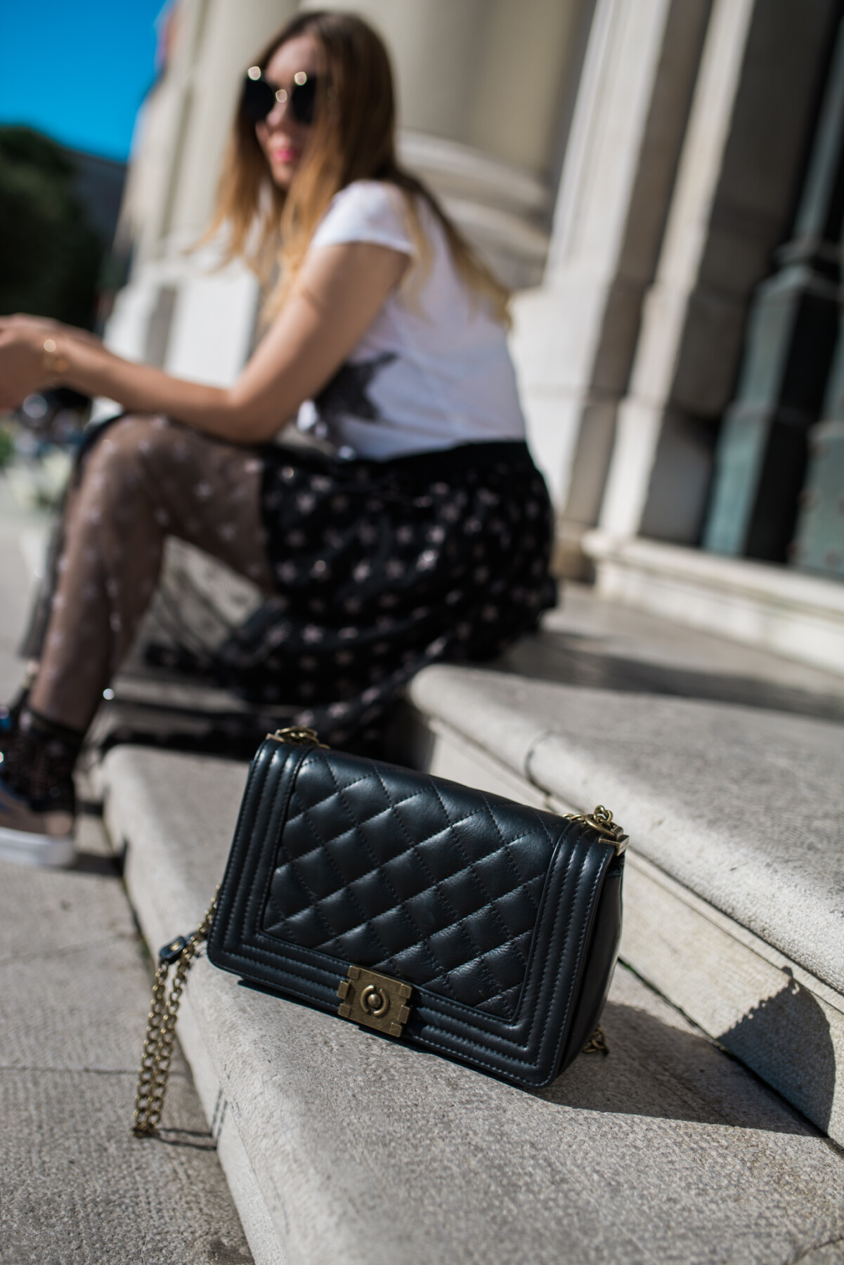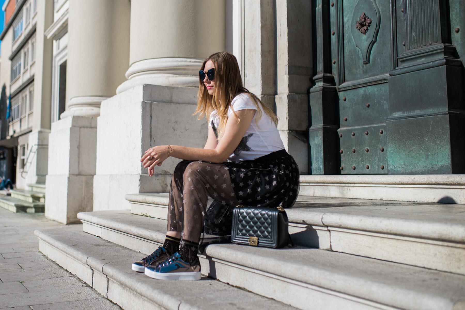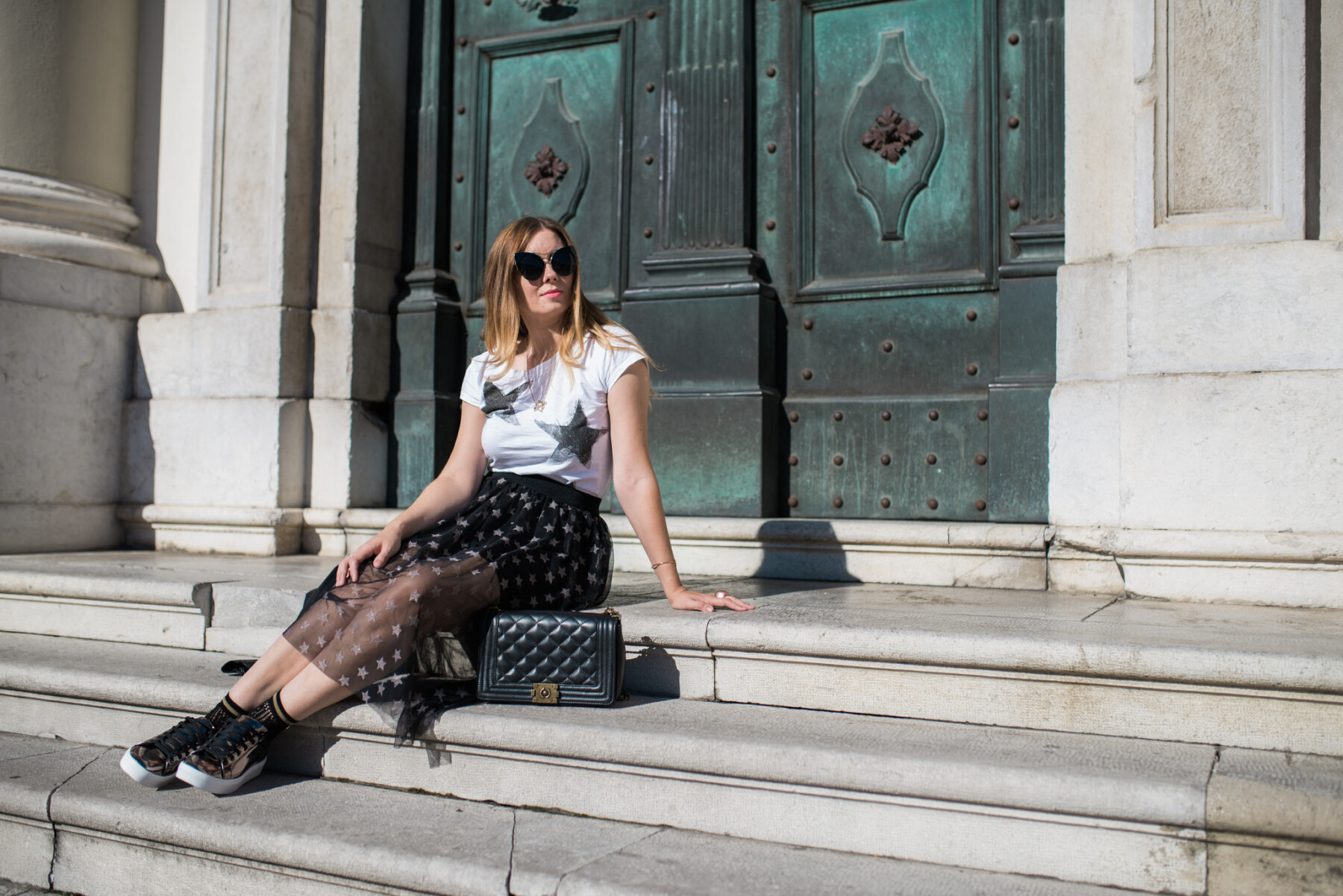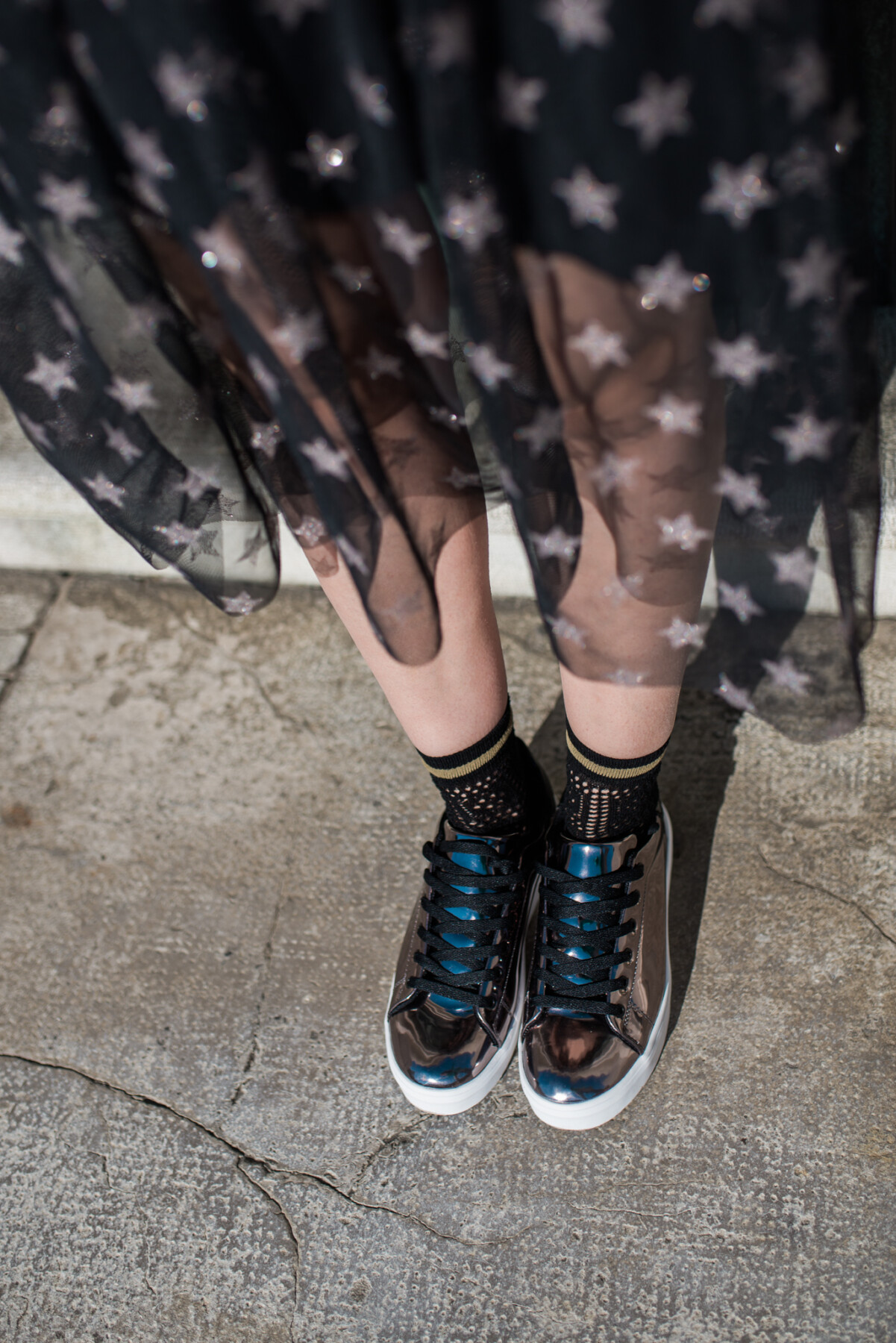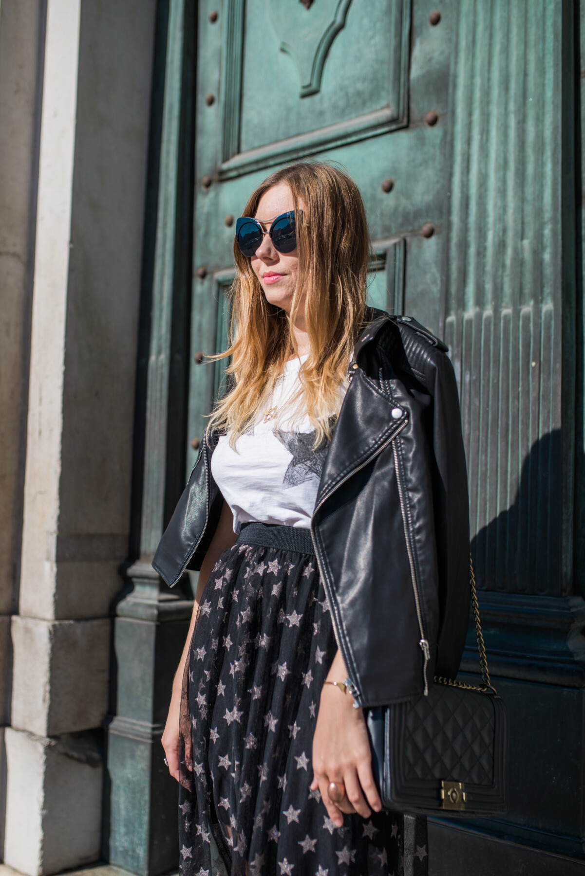 Un mix tra rock e quello di ballerina mi sembrava davvero una bella combinazione. Ho scelto una gonna in tulle con le stelle, una t-shirt bianca, una giacca in pelle e un paio di scarpe metallizzate. Ricordatevi che quest’autunno/inverno tutto ciò che ha l’effetto metallizzato va di moda. Dalle unghie, scarpe, alle borse e le giacche. Gucci con il suo vestito verde scarabeo ha fatto un grande colpo. Tempo fa vi avevo già fatto vedere un mio outfit con una gonna a pieghe metallizzata, l’outfit lo potete vedere QUI. Intanto vi lascio con un nuovo outfit, fatemi sapere se vi piace!