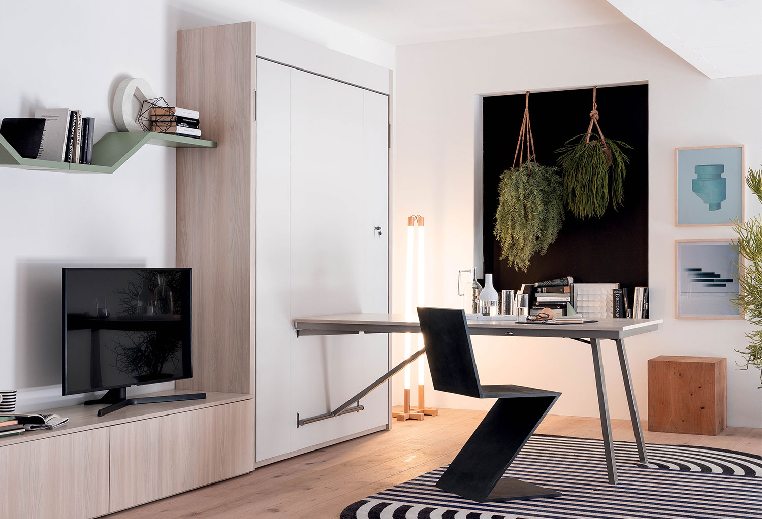 • Dietro il divano c’è un armadio in cui è nascosto il letto. Basta appoggiare i cuscini dal divano sul pavimento e tirare fuori il letto. Questo copre il divano e, magicamente, la stanza si trasforma in una camera da letto. smartarredodesign.com (4.278,06 €)