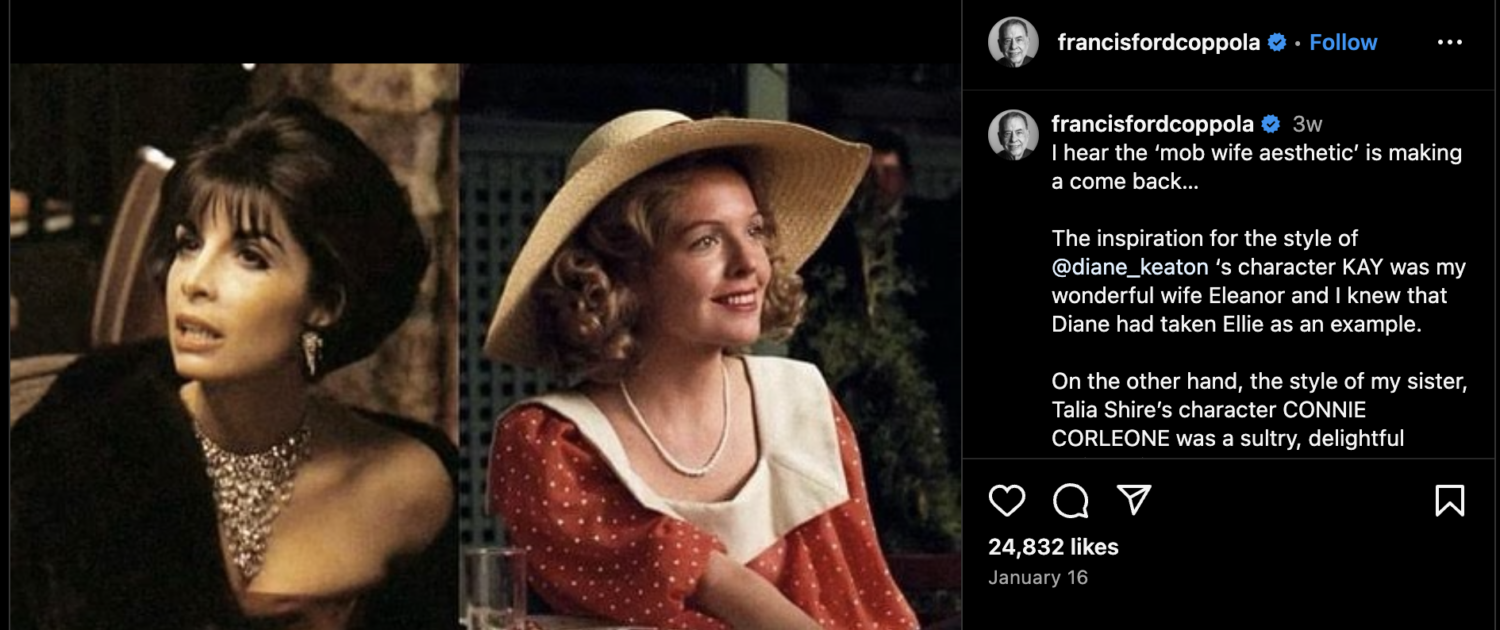 La tendenza Mob Wife trae ispirazione dalla cultura popolare, inclusi film, serie TV e documentari che raccontano storie di mafia e crimine organizzato. Icone come Carmela Soprano da “I Soprano” e Karen Hill da “Quei Bravi Ragazzi” hanno contribuito a plasmare l’immaginario di questa estetica, con il loro stile lussuoso, maestoso e talvolta provocatorio. Un trend che ha “scomodato” anche il maestro Francis Ford Coppola che gli ha dedicato un post su Instagram!