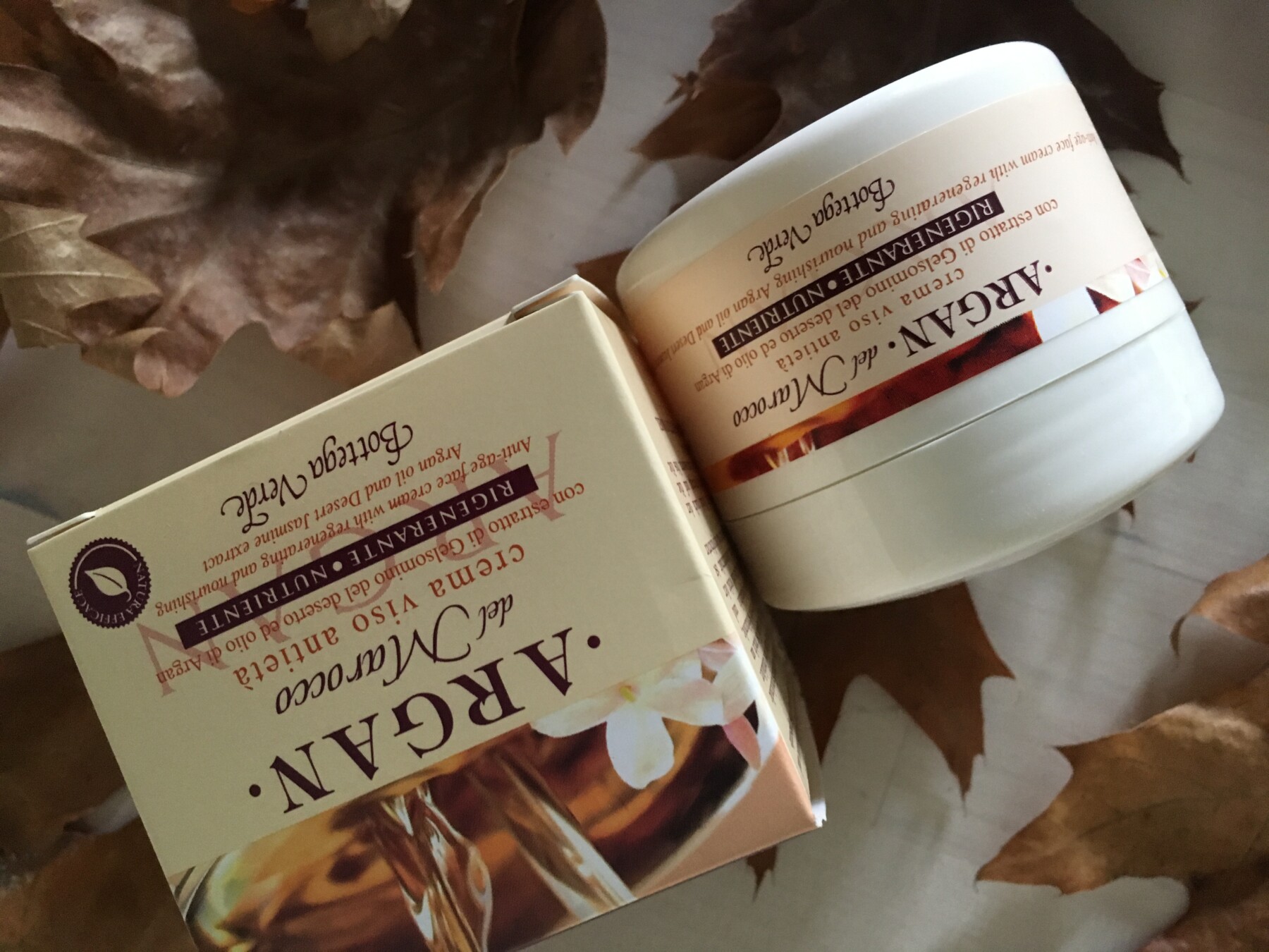 Argan del Marocco – Crema viso anti età: con estratto di Gelsomino del deserto e olio di Argan rigenera e nutre la pelle. Adatta a tutti i tipi di pelle, è una crema ricca, super nutriente, non unge. La pelle dopo l’uso è più luminosa, morbida e vellutata.