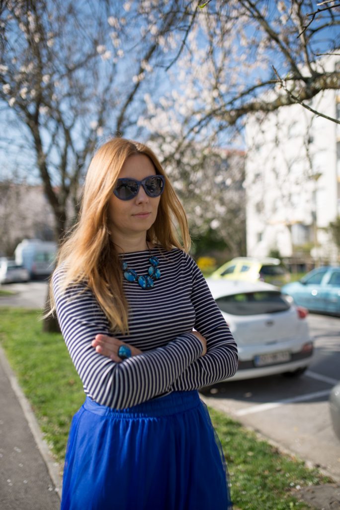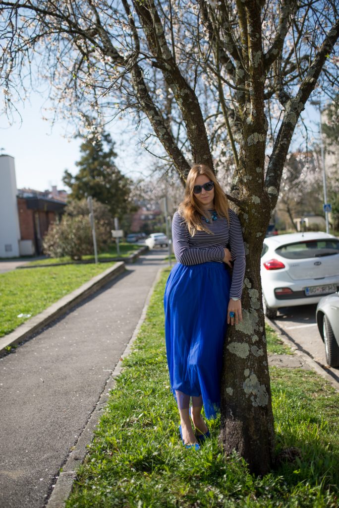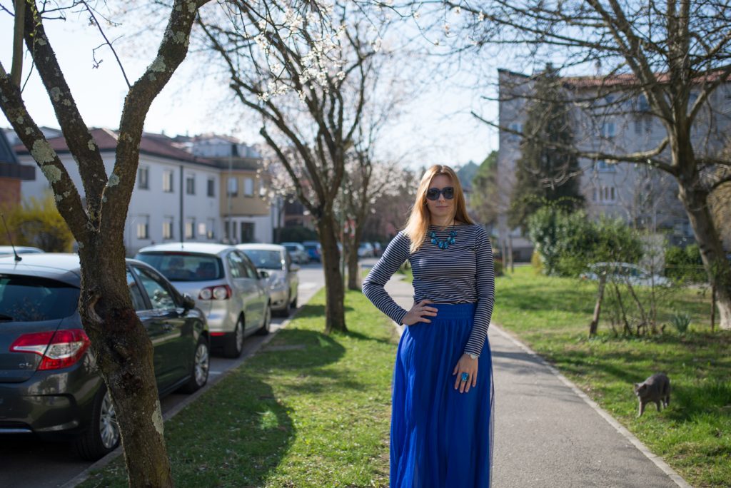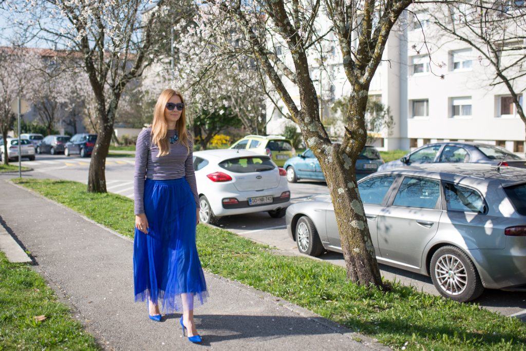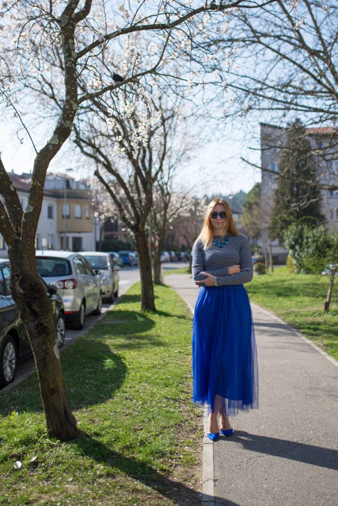 In passato vi avevo già fatto vedere qualche outfit in blu, come, ad esempio, con l’abito lungo a pizzo (potete vederlo QUI), oppure la gonna blu (potete vederlo QUI). Oggi torno con un outfit in colore blu, con una gonna in tulle midi perché, come ben sapete, io adoro il tulle. Mi sono subito innamorata di questa gonna, appena l’ho vista, sia per il colore che per la lunghezza. Questo tipo di gonna si può indossare per le cerimonie, visto che siamo entrati nella stagione delle cerimonie, con una camicia o una blusa bianca, il che è un classico. Se volete invece uscire dagli schemi, allora abbinatela ad una camicia con le stampe gialle o rosa, oppure a pois.