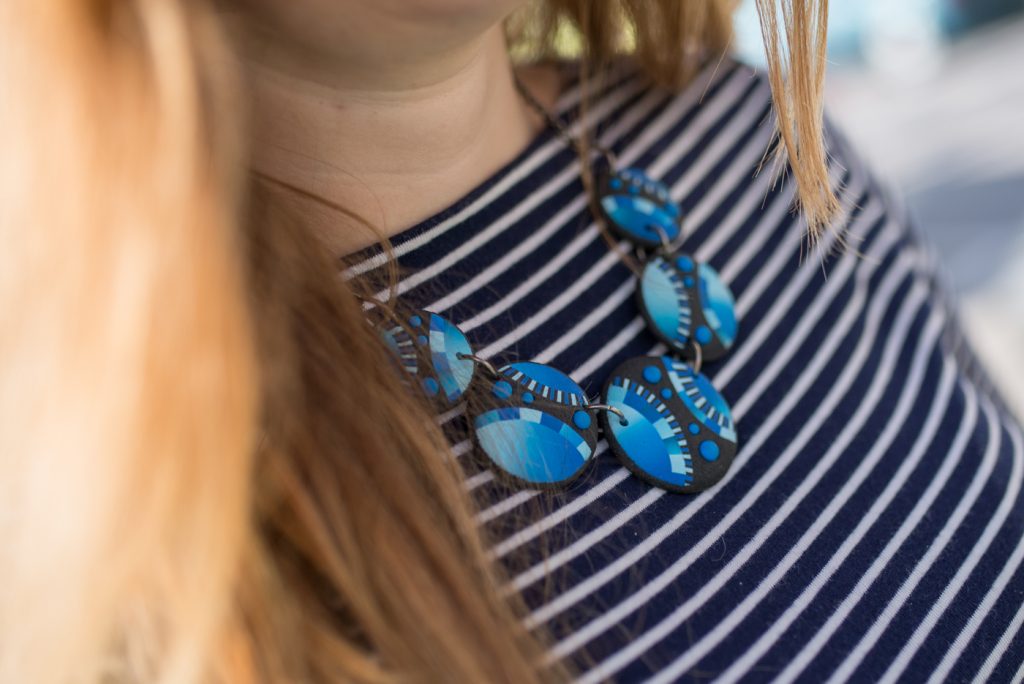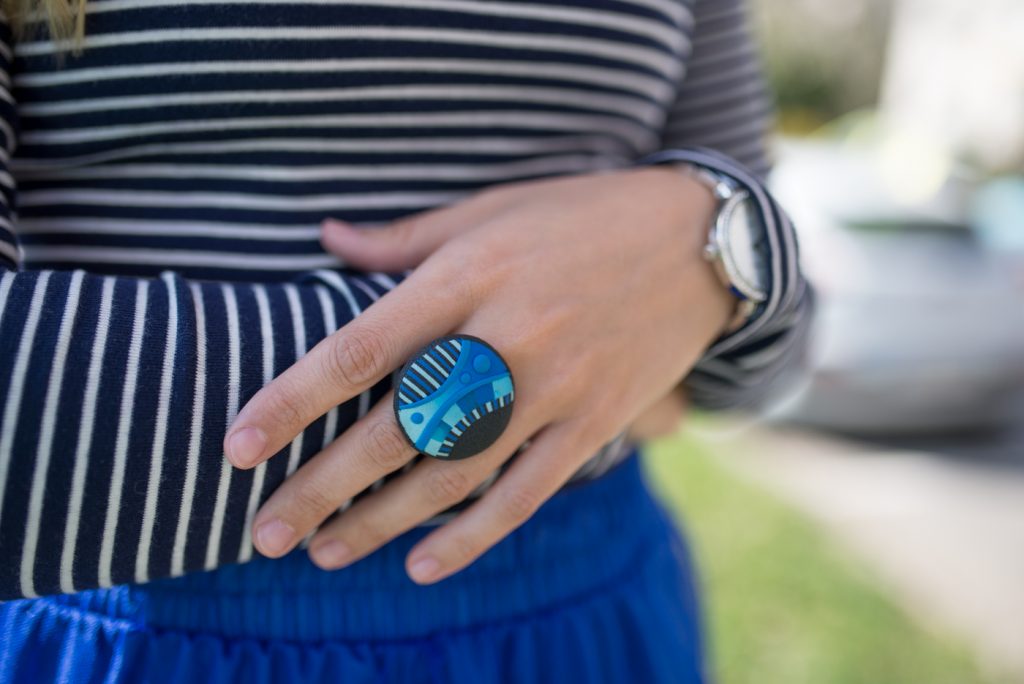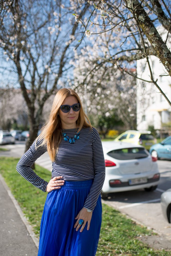 Come vedete io l’ho abbinata ad una maglia a righe e ad un paio di décolleté. Adoro le righe e le porto in tutte le stagioni ormai. Come accessori invece ho scelto l’anello e la collana di una giovane designer slovena, della quale vi avevo già fatto vedere le creazioni QUI. Vi piace il mio outfit?