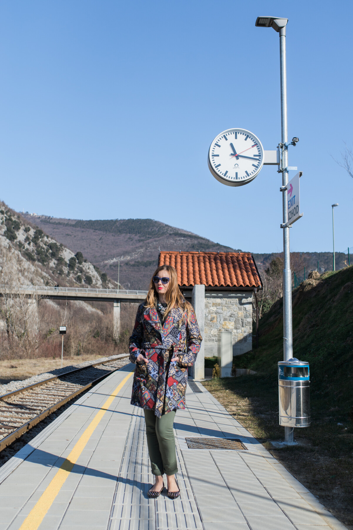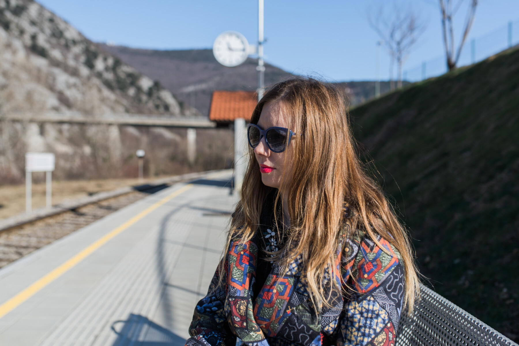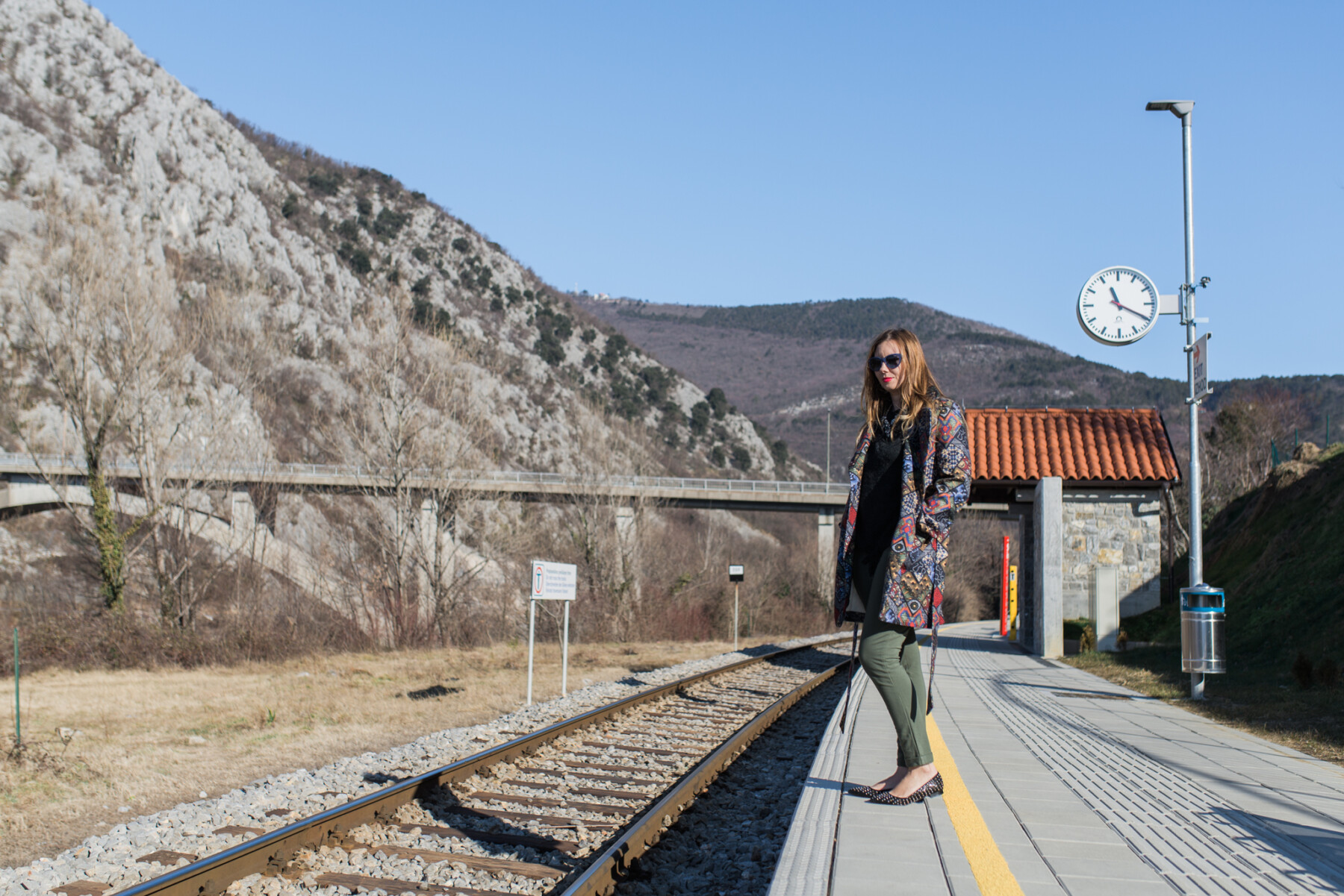 Oggi invece ritorno con un outfit scattato in una fermata del treno in Slovenia. Dovete sapere che 15 anni fa io prendevo quasi ogni weekend il treno (questo ancora prima di avere la patente) per andare a Ljubljana (capitale slovena), dove andavo a trovare gli amici, i parenti ma anche per fare la modella. Dovete sapere che da Nova Gorica a Ljubljana ci si sta un ‘ oretta in macchina, invece col treno ci mettevo anche tre ore. Eh si era lunga, mi ero anche già dimenticata di tutte quelle ore passate in treno. Infatti dal momento che ho conseguito la patente, i viaggi in treno sono diventati solo un lontano ricordo.