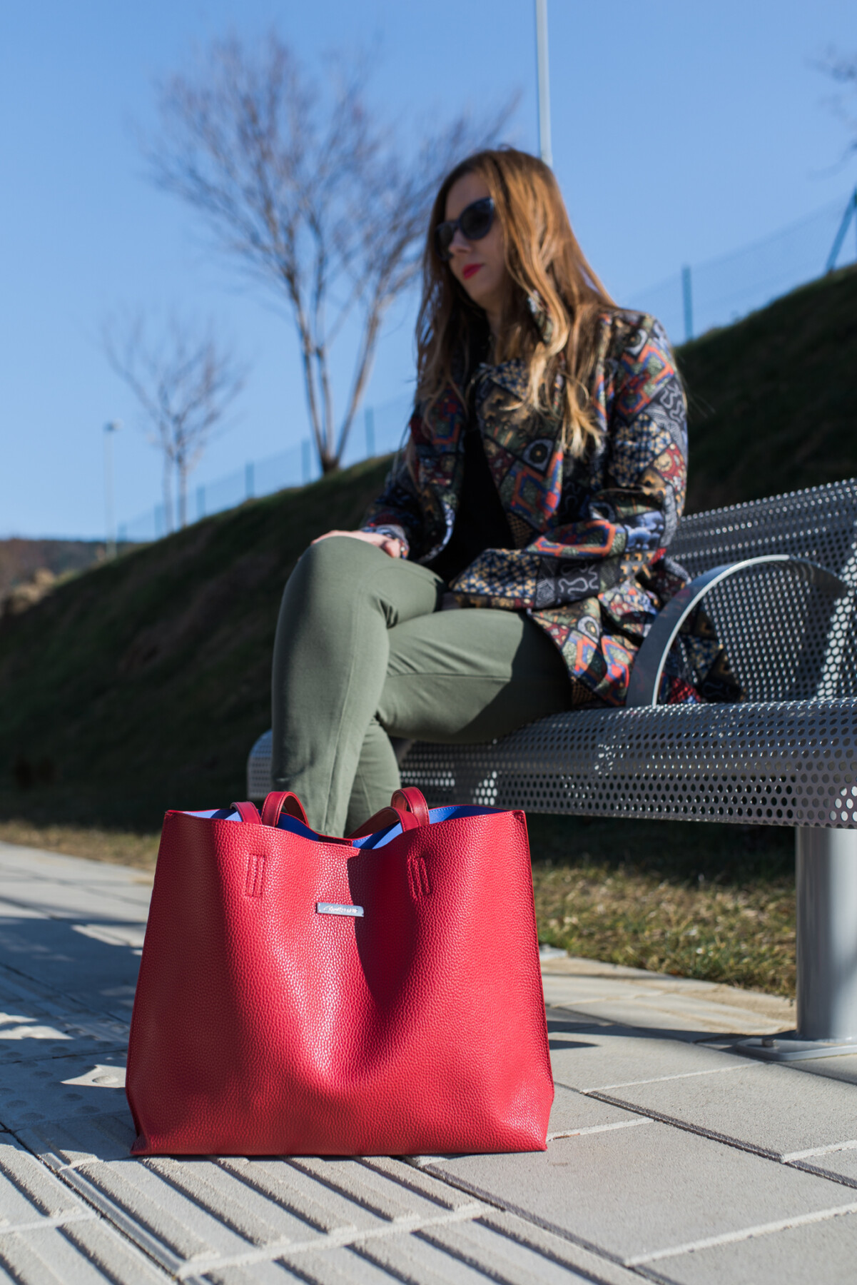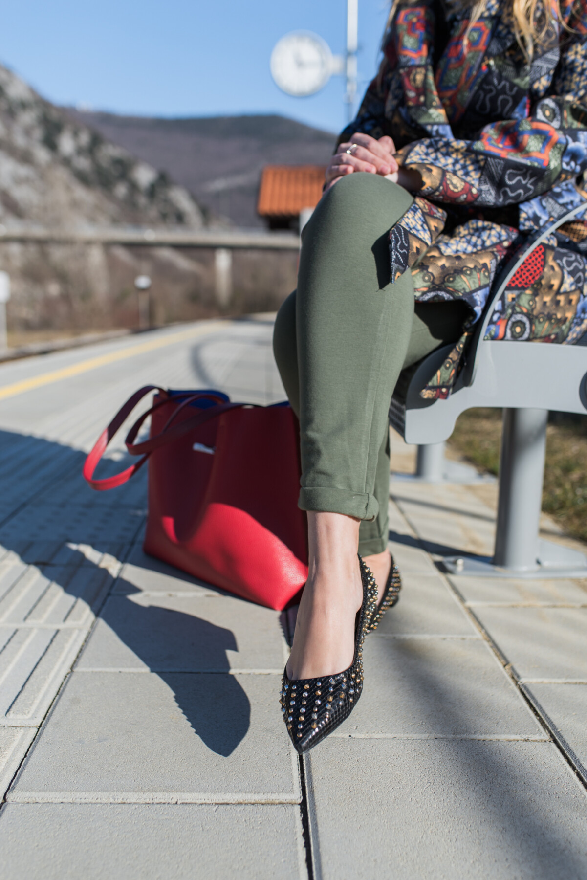 Per questo look di oggi ho scelto un paio di pantaloni verdi, li ho abbinati al maglione nero, che con il verde vanno benissimo. Poi ho scelto un capotto a fantasia, una borsa shopper rossa e le ballerine a punta con le borchie. Vi piace il mio look?