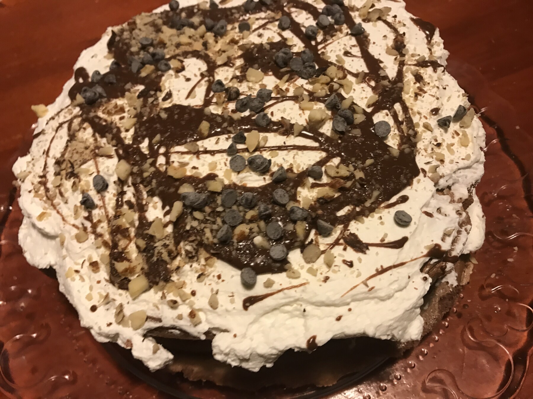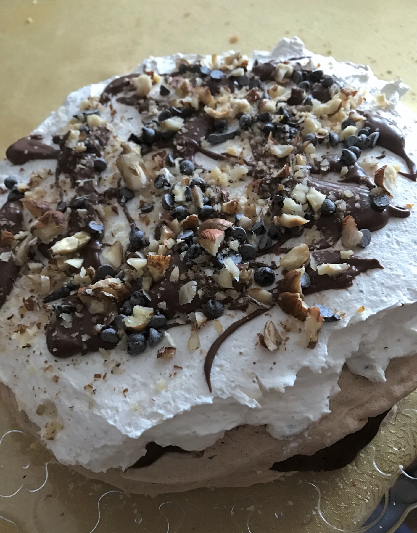 Prendete una delle due basi delle meringhe, mettete sopra metta di ganache di cioccolato, metta della crema di nocciole e cospargete con le nocciole tritate. Mettete sopra l’altra metà di meringa e ripetete lo stesso procedimento di prima, solo che lasciate un pò di ganache di cioccolato per decorazione finale. Sopra la torta mettete le nocciole tritate, le gocce di cioccolato e decorate con il ganache di cioccolato restante. Conservate nel frigo e servite.
