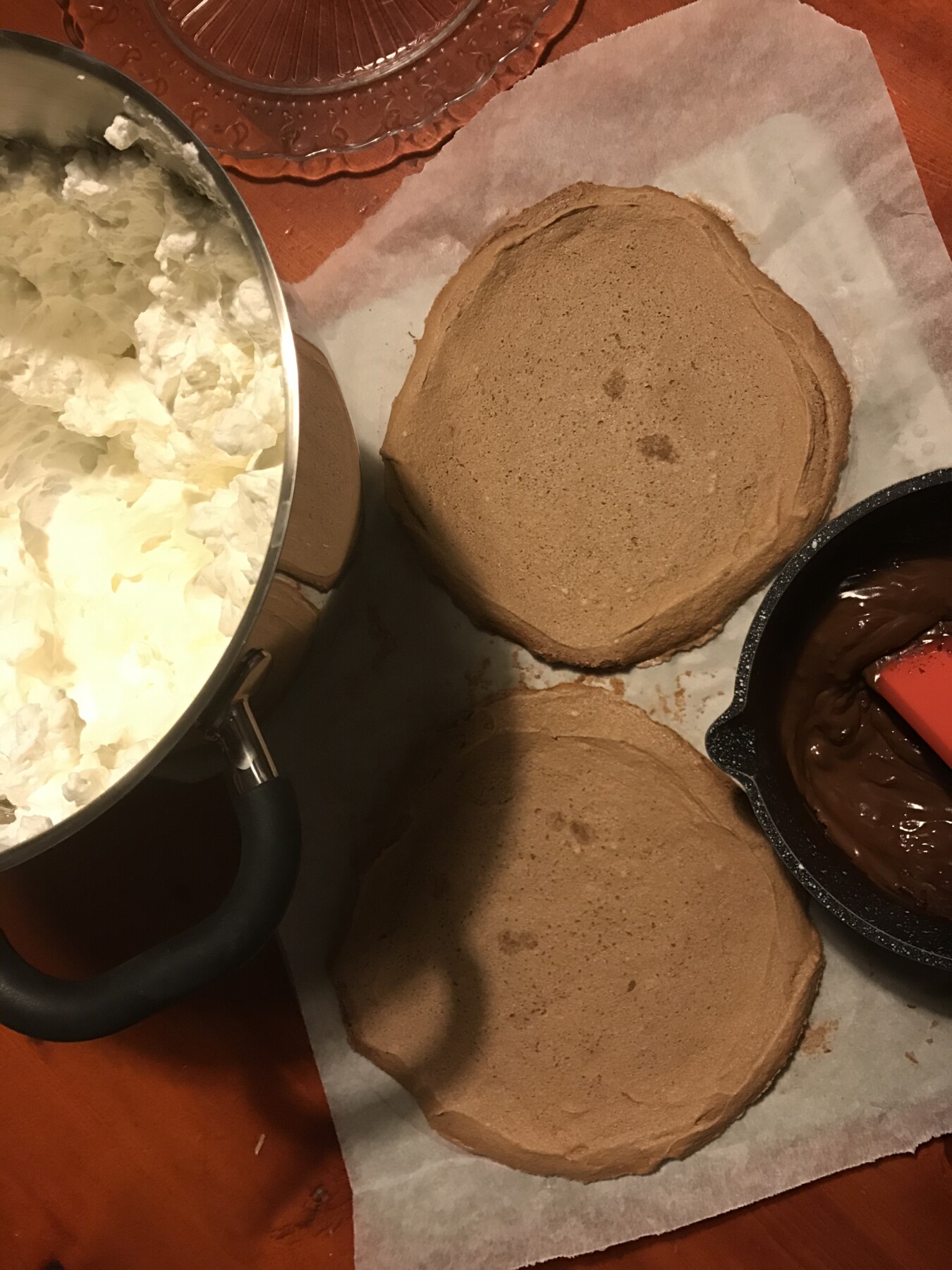 Fate preriscaldare il forno a 150 gradi. Sulla carta forno disegnate due cerchi del diametro 15-18 cm e mettete nella teglia la carta forno. Montate gli albumi con un pizzico di sale a neve, aggiungete a pioggia lo zucchero a velo, mescolando. Alla fine aggiungete il succo del limone e l’amido di mais. Mescolate delicatamente e alla fine aggiungete anche il cacao. Mettete la meringa sui due cerchi, mettete in forno e abbassatelo a 120 gradi. Lasciate cuocere per 90 minuti, senza aprire il forno! Dopo il tempo trascorso di cottura, spegnete il forno, aprite un po’ la porta del forno e lasciate che si raffredda (meglio tutta la notte).