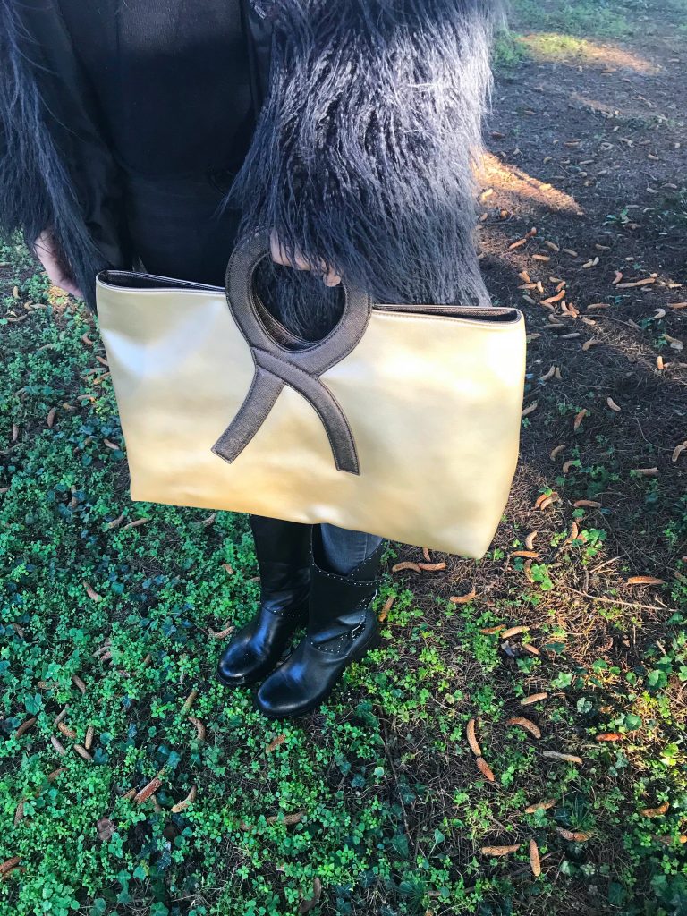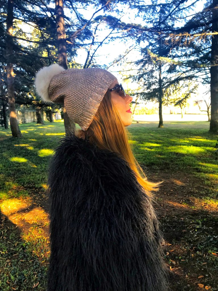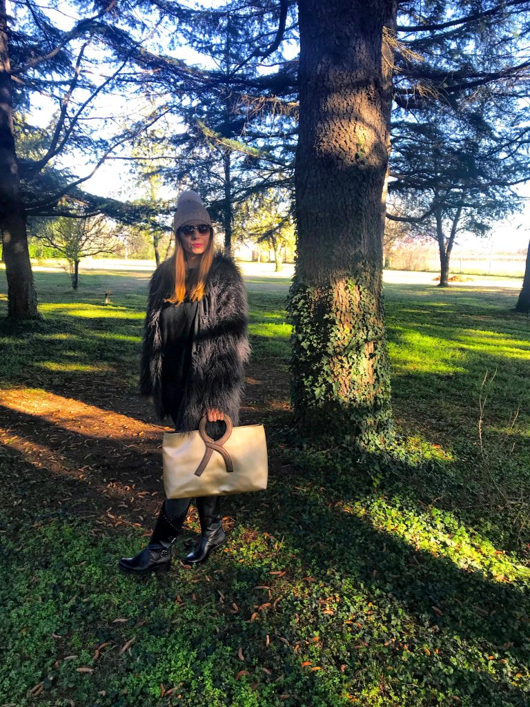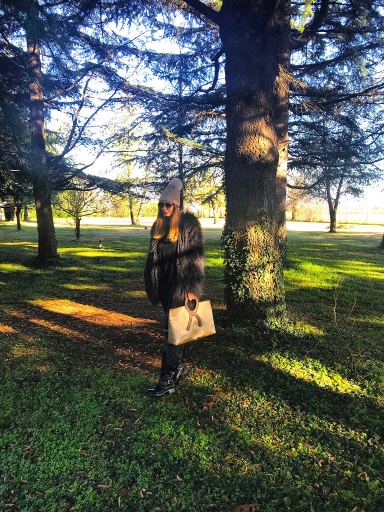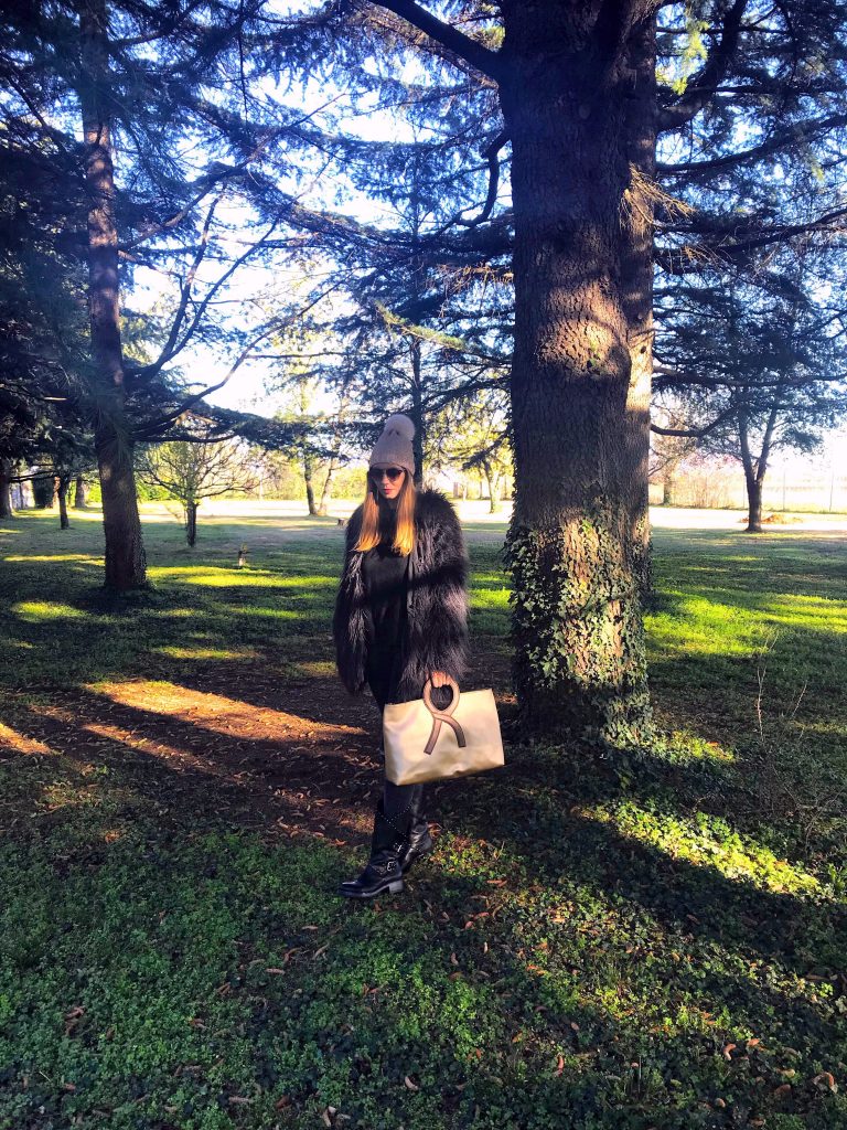 Mi sarebbe piaciuto conoscere questa donna straordinaria, visto che ha fatto grandi rivoluzioni nella moda italiana e che in tanti l’hanno copiata. Purtroppo questo non sarà possibile, visto che sette anni fa Roberta di Camerino è deceduta, ma nel mio armadio c’è un accessorio con la sua firma. Quest’autunno/inverno vanno tanto di moda le stampe metallizzate ed io ho scelto la borsa in color oro. Oggi vi faccio vedere il mio look in total black con la borsa e il cappellino in color oro. Un look rock ma con dettagli raffinati e di stile. Vi piace il mio look?