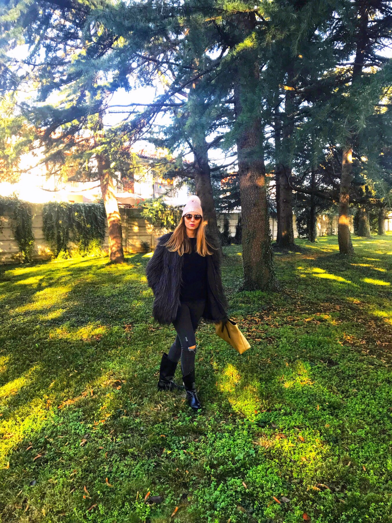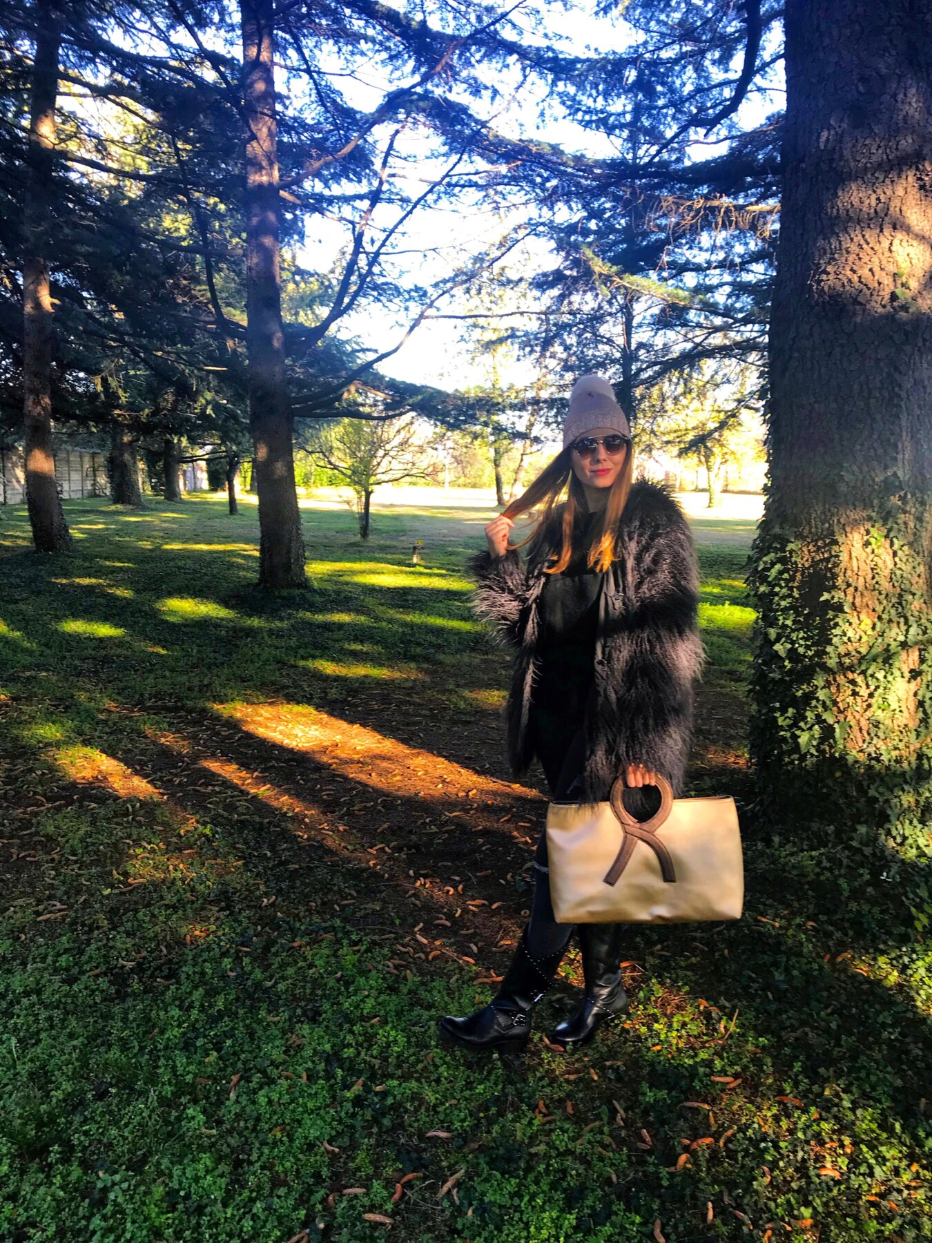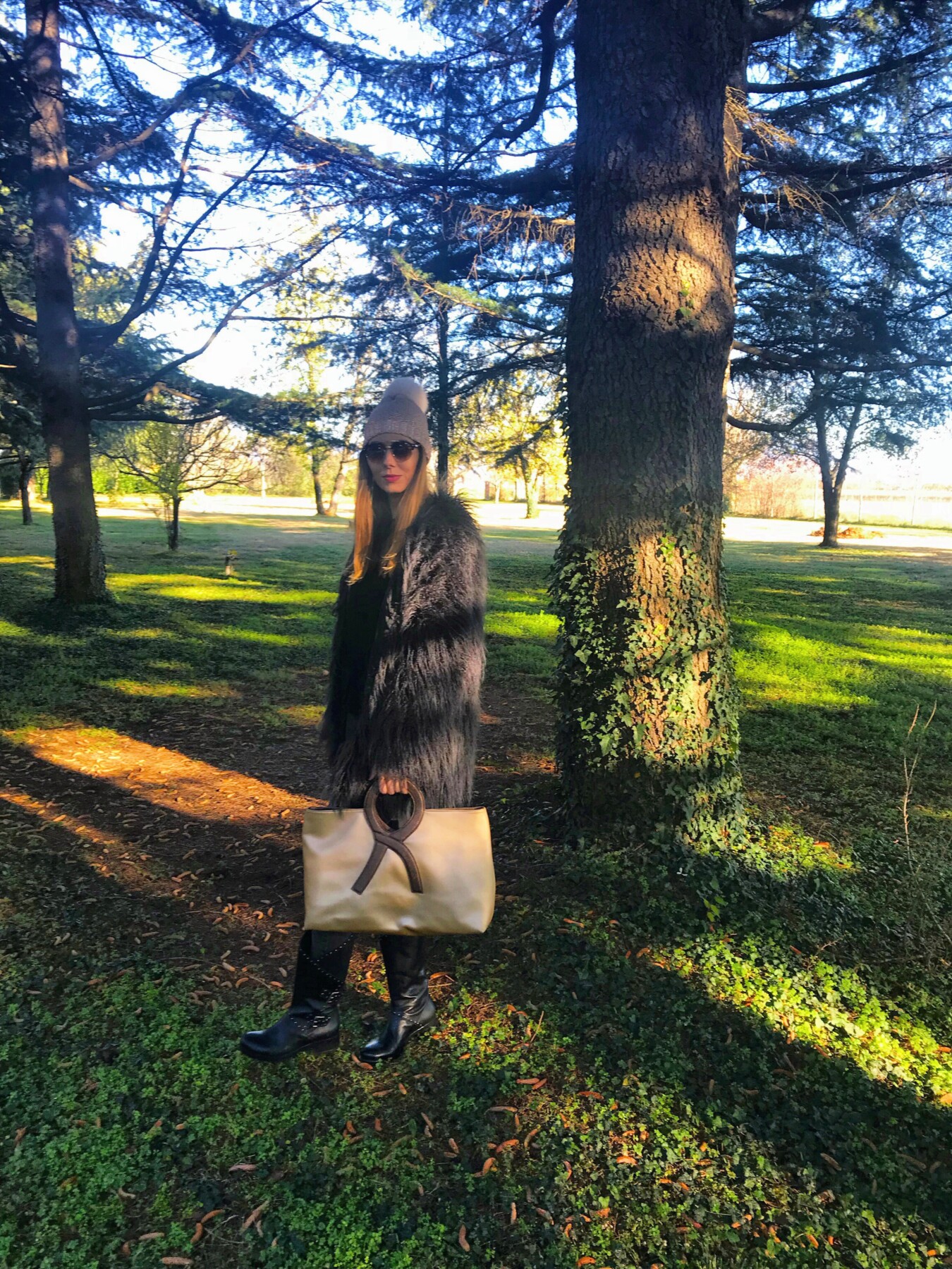 Mi sarebbe piaciuto conoscere questa donna straordinaria, visto che ha fatto grandi rivoluzioni nella moda italiana e che in tanti l’hanno copiata. Purtroppo questo non sarà possibile, visto che sette anni fa Roberta di Camerino è deceduta, ma nel mio armadio c’è un accessorio con la sua firma. Quest’autunno/inverno vanno tanto di moda le stampe metallizzate ed io ho scelto la borsa in color oro. Oggi vi faccio vedere il mio look in total black con la borsa e il cappellino in color oro. Un look rock ma con dettagli raffinati e di stile. Vi piace il mio look?
