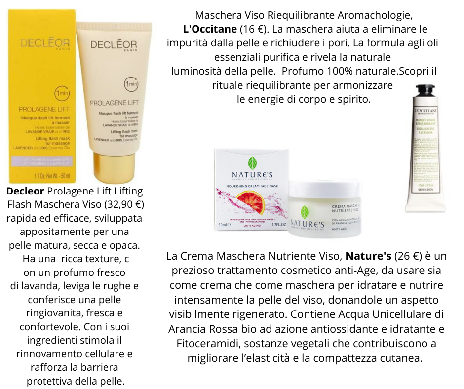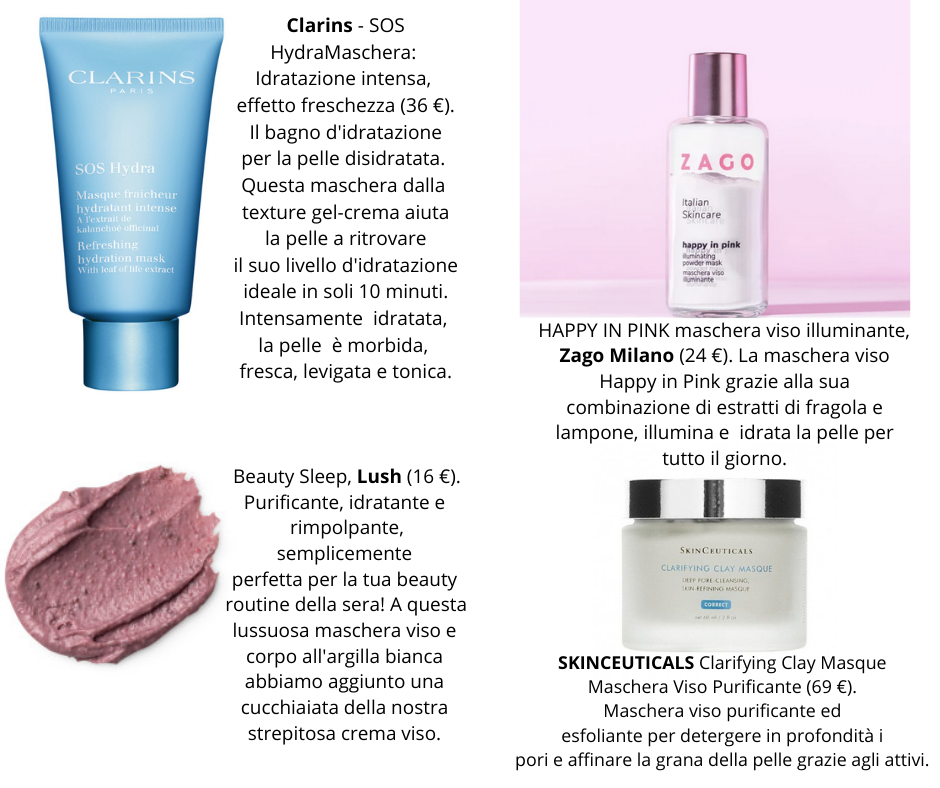Ci sono marchi che hanno creato una linea delle maschere multitasking, per poterle applicare sul viso. Potete, però, sempre scegliere quelle che vi piacciono di più, che conoscete e usate già da anni. Intanto qui sotto potete trovare la maschere perfette per fare il multitasking 😉 Siete pronte per dedicare un po’ di tempo solo a voi stesse? Fatemi sapere poi come vi trovate con questo metodo.