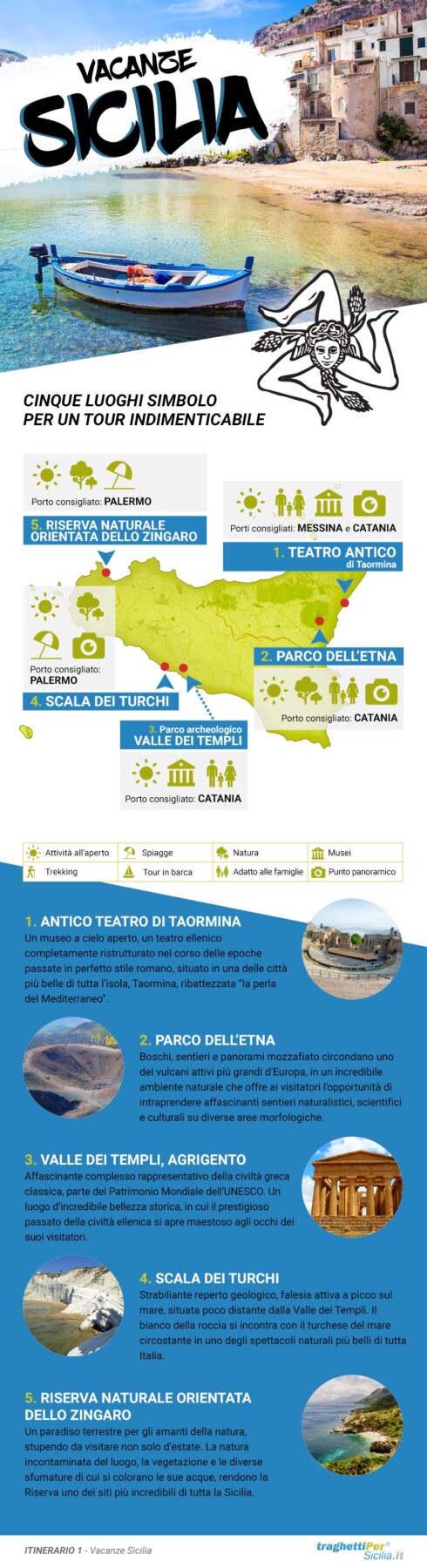 La settimana scorsa mia suocera è tornata dalla Sicilia, dove ha passato 8 giorni bellissimi durante i quali ha visitato ogni giorno una città diversa. So già che se la nostra meta sarà la Sicilia, sarà dura anche decidere in quale versante dell’isola soggiornare, vista l’immensa ricchezza di natura, storia e tradizioni che caratterizza qualsiasi suo angolo. Navigando in Rete alla ricerca di idee per il nostro possibile viaggio in Sicilia, mi sono imbattuta in un’interessante infografica che mostra cinque luoghi affascinanti dell’isola. Eccoli di seguito: Cosa vedere in Sicilia