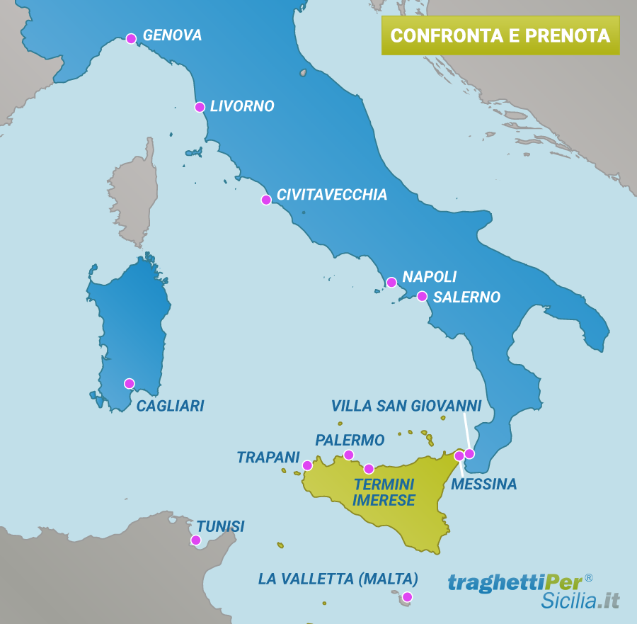 Porti e compagnie di navigazione per la Sicilia I principali porti di partenza per la Sicilia sono Genova, Civitavecchia, Napoli, Salerno, Tunisi, Cagliari, Reggio Calabria e Villa San Giovanni. Tra i principali porti di arrivo della Sicilia, ci sono Palermo, Messina, Catania, Trapani, Porto Empedocle, Milazzo e i porti degli arcipelaghi: Eolie ed Egadi. Basta un click ed il gioco è fatto.